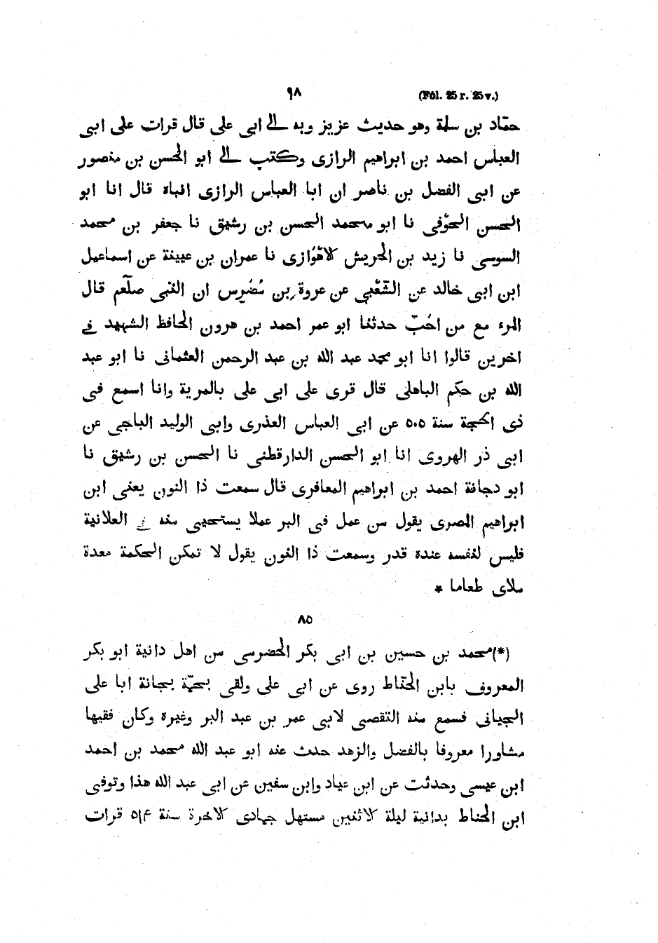 حَمَّادِ بْنِ سَلَمَةَ وَهُوَ حَدِيثٌ عَزِيزٌ وَبِهِ إِلَى أَبِي عَلِيٍّ قَالَ قَرَأْتُ عَلَى أَبِي الْعَبَّاسِ أَحْمَدَ بْنِ إِبْرَاهِيمَ الرَّازِيِّ وَكَتَبَ إِلَى أَبُو الْحَسَنِ بْنُ مَنْصُورٍ عَنْ أَبِي الْفَضْلِ بْنِ نَاصِرٍ أَنَّ أَبَا الْعَبَّاسِ الرَّازِيَّ أَنْبَأَهُ قَالَ أَنَا أَبُو الْحَسَنِ الْحَوْفِيُّ نا أَبُو مُحَمَّدٍ الْحَسَنُ بْنُ رَشِيقٍ نَا جَعْفَرُ بْنُ مُحَمَّدٍ السُّوسِيُّ نا زَيْدُ بْنُ الْحُرَيْشِ الأَهْوَازِيُّ نا عمران بن عيينة عن إسماعيل ابن أَبِي خَالِدٍ عَنِ الشَّعْبِيِّ عَنْ عُرْوَةَ بْنِ مُضَرِّسٍ أَنَّ النَّبِيَّ صَلَّى اللَّهُ عَلَيْهِ وَسَلَّمَ قَالَ الْمَرْءُ مَعَ مَنْ أَحَبَّ حَدَّثَنَا أَبُو عمر أحمد بن هرون الْحَافِظُ الشَّهِيدُ فِي آخَرِينَ قَالُوا أَنَا أَبُو مُحَمَّدٍ عَبْدُ اللَّهِ بْنُ عَبْدِ الرَّحْمَنِ الْعُثْمَانِيُّ نا أَبُو عَبْدِ اللَّهِ بْنُ حَكَمٍ الْبَاهِلِيُّ قال قرى عَلَى أَبِي عَلِيٍّ بِالْمَرِيَّةِ وَأَنَا أَسْمَعُ فِي ذِي الْحَجَّةِ سَنَةَ 505 عَنْ أَبِي الْعَبَّاسِ الْعُذْرِيِّ وَأَبِي الْوَلِيدِ الْبَاجِيِّ عَنْ أَبِي ذَرٍّ الْهَرَوِيِّ أَنَا أَبُو الْحَسَنِ الدَّارَقُطْنِيُّ نَا الْحَسَنُ بْنُ رَشِيقٍ نا أَبُو دُجَانَةَ أَحْمَدُ بْنُ إِبْرَاهِيمَ الْمَعَافِرِيُّ قَالَ سَمِعْتُ ذَا النُّونِ يَعْنِي ابْنَ إبراهيم المصري يقول من عمل في البر عملاً يستحيي مِنْهُ فِي الْعَلانِيَةَ فَلَيْسَ لِنَفْسِهِ عِنْدَهُ قَدْرٌ وَسَمِعْتُ ذَا النُّونِ يَقُولُ لا تُمْكِنِ الْحِكْمَةَ مِعَدَةً مَلأَى طَعَامًا مُحَمَّدُ بْنُ حُسَيْنِ بْنِ أَبِي بَكْرٍ الْحَضْرَمِيُّ مِنْ أَهْلِ دَانِيَةَ أَبُو بَكْرٍ الْمَعْرُوفُ بِابْنِ الْحَنَّاطِ رَوَى عَنْ أَبِي عَلِيٍّ وَلَقِيَ بِحمَّةِ بِجَانَةَ أَبَا عَلِيٍّ الْجَيَّانِيَّ فَسَمِعَ مِنْهُ التَّقَصِّيَ لأَبِي عُمَرَ بْنِ عَبْدِ الْبَرِّ وَغَيْرِهِ وَكَانَ فَقِيهًا مُشَاوِرًا مَعْرُوفًا بِالْفَضْلِ وَالزُّهْدِ حَدَّثَ عَنْهُ أَبُو عَبْدِ اللَّهِ مُحَمَّدُ بن أحمد ابن عيسى وحدثت عن ابن عياد وابن سفين عَنْ أَبِي عَبْدِ اللَّهِ هَذَا وَتُوُفِّيَ ابْنُ الْحَنَّاطِ بِدَانِيَةَ لَيْلَةَ الاثْنَيْنِ مُسْتَهَلَّ جُمَادَى الآخِرَةِ سنة 514 قرأت