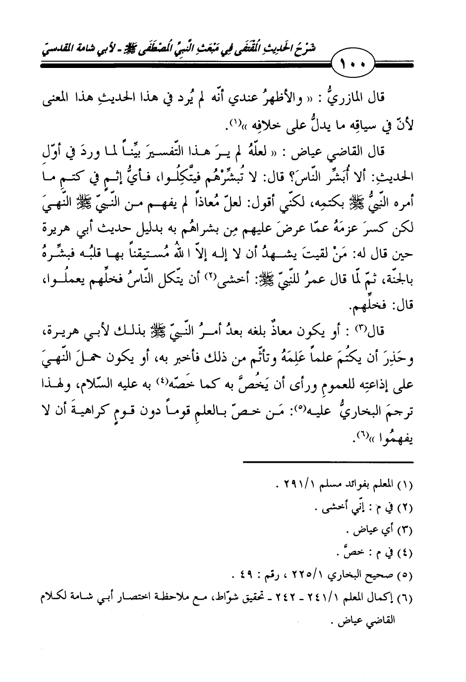 قَالَ القَاضِي عِيَاض: " لَعَلَّه لم ير هَذَا التَّفْسِير بَينا لما ورد فِي أول الحَدِيث: أَلا أبشر النَّاس؟ قَالَ: لَا تبشرهم فيتكلوا، فَأَي إِثْم فِي كتم مَا أَمر النَّبِي - صلى الله عليه وسلم - بكتمه، لكني أَقُول: لَعَلَّ معَاذًا لم يفهم من النَّبِي - صلى الله عليه وسلم - النَّهْي لَكِن كسر عزمه عَمَّا عرض عَلَيْهِم من بشراهم بِهِ بِدَلِيل حَدِيث أبي هُرَيْرَة حِين قَالَ لَهُ: من لقِيت يشْهد أَن لَا إِلَه إِلَّا الله مُسْتَيْقنًا بهَا قلبه فبشره بِالْجنَّةِ، ثمَّ لما قَالَ عمر للنَّبِي - صلى الله عليه وسلم -: أخْشَى أَن يتكل النَّاس فخلهم يعملوا، قَالَ: فخلهم.