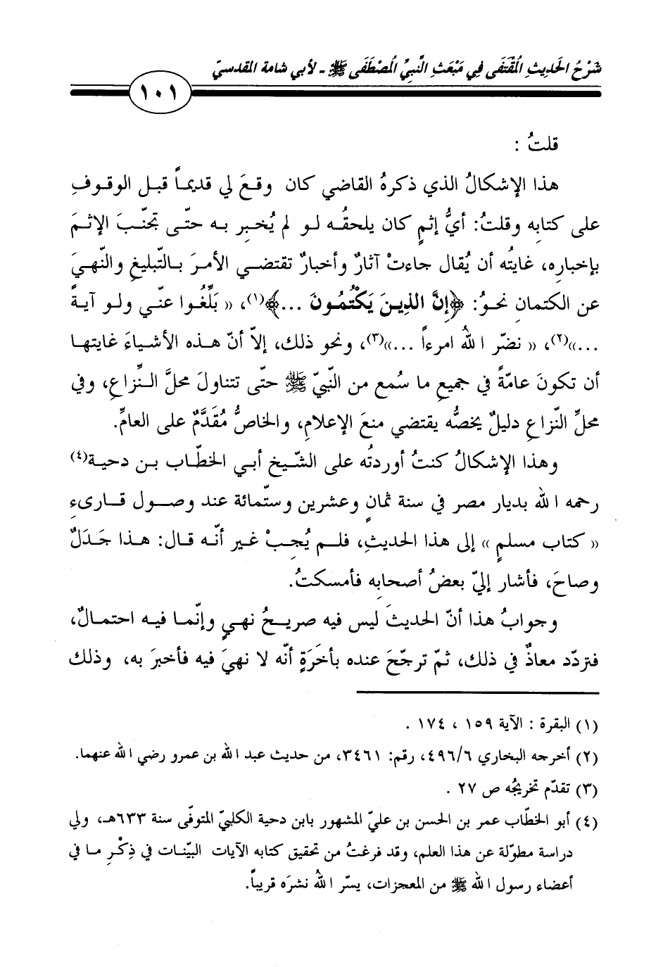 هَذَا الْإِشْكَال الَّذِي ذكره القَاضِي كَانَ وَقع لي قَدِيما قبل الْوُقُوف على كِتَابه وَقلت: أَي إِثْم كَانَ يلْحقهُ لَو لم يخبر بِهِ حَتَّى تجنب الْإِثْم بإخباره، غَايَته أَن يُقَال جَاءَت آثَار وأخبار تَقْتَضِي الْأَمر بالتبليغ وَالنَّهْي عَن الكتمان نَحْو: {إِن الَّذين يكتمون} ، " بلغُوا عني وَلَو آيَة ... "، " نضر الله امرءأ ... "، وَنَحْو ذَلِك، إِلَّا أَن هَذِه الْأَشْيَاء غايتها أَن تكون عَامَّة فِي جَمِيع مَا سمع من النَّبِي - صلى الله عليه وسلم - حَتَّى تتَنَاوَل مَحل النزاع، وَفِي مَحل النزاع دَلِيل يَخُصُّهُ يَقْتَضِي منع الْإِعْلَام، وَالْخَاص مقدم على الْعَام.