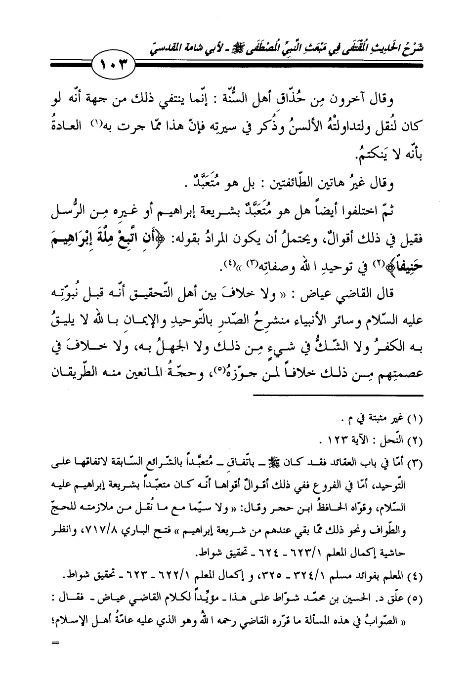 ثمَّ اخْتلفُوا أَيْضا هَل هُوَ متعبد بشريعة إِبْرَاهِيم أَو غَيره من الرُّسُل فَقيل فِي ذَلِك أَقْوَال، وَيحْتَمل أَن يكون المُرَاد بقوله: {أَن اتبع مِلَّة إِبْرَاهِيم حَنِيفا} فِي تَوْحِيد الله وَصِفَاته ".