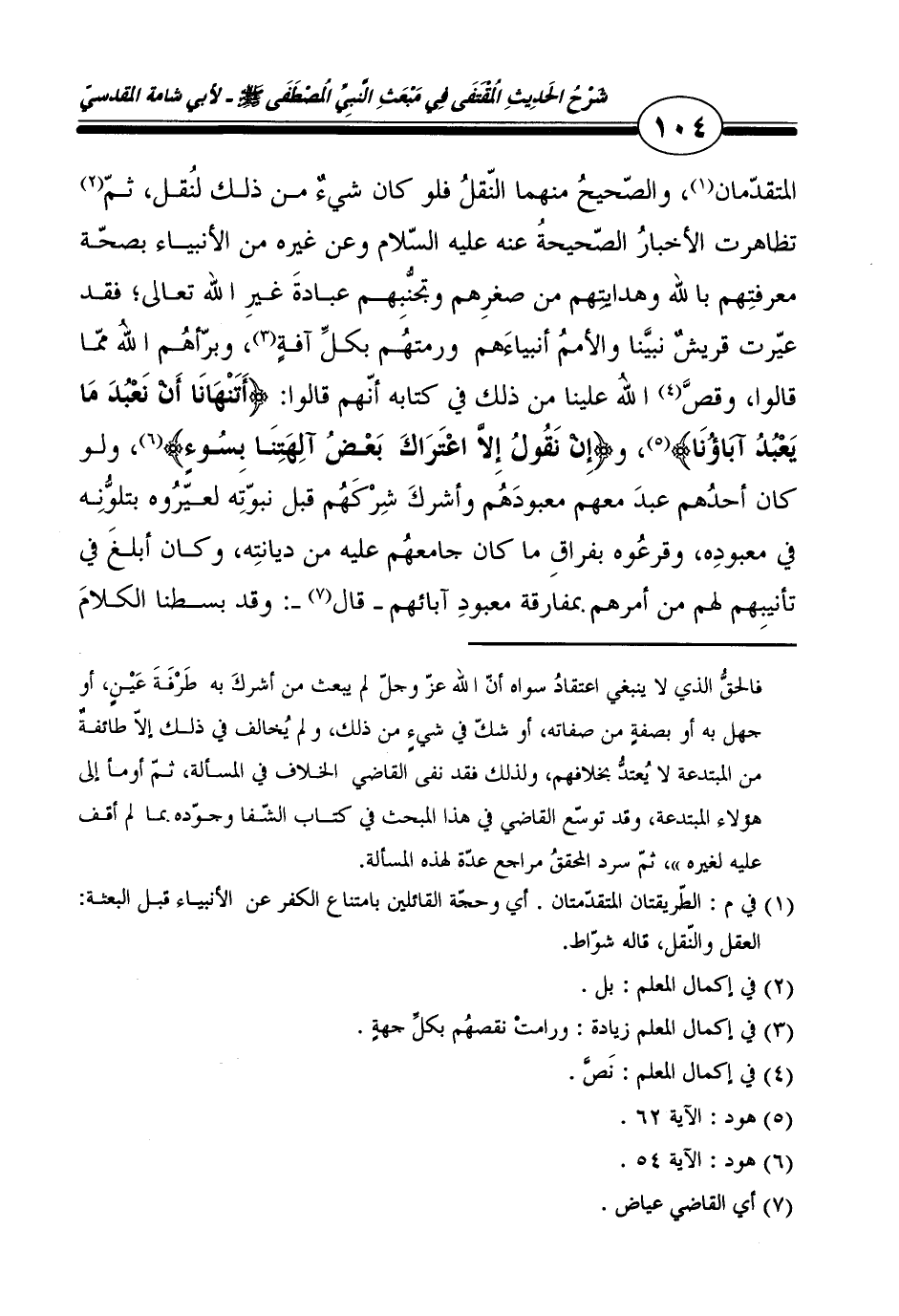 المتقدمان وَالصَّحِيح مِنْهُمَا النَّقْل فَلَو كَانَ شَيْء من ذَلِك لنقل، ثمَّ تظاهرت الْأَخْبَار الصَّحِيحَة عَنهُ عَلَيْهِ السَّلَام وَعَن غَيره من الْأَنْبِيَاء بِصِحَّة معرفتهم بِاللَّه وهدايتهم من صغرهم وتجنبهم عبَادَة غير الله تَعَالَى، فقد عيرت قُرَيْش نَبينَا والأمم أنبياءهم ورمتهم بِكُل آفَة، وبرأهم الله مِمَّا قَالُوا، وقص الله علينا من ذَلِك فِي كِتَابه أَنهم قَالُوا: {أتنهانا أَن نعْبد مَا يعبد آبَاؤُنَا} ، {إِن تَقول إِلَّا اعتراك بعض آلِهَتنَا بِسوء} ، وَلَو كَانَ أحدهم عبد مَعَهم معبودهم وأشرك شركهم قبل نبوته لعيروه بتلونه فِي معبوده، وقرعوه بِفِرَاق مَا كَانَ جامعهم عَلَيْهِ من ديانته، وَكَانَ أبلغ فِي تأنيبهم لَهُم من أَمرهم بمفارقة معبود آبَائِهِم - قَالَ - وَقد بسطنا الْكَلَام
