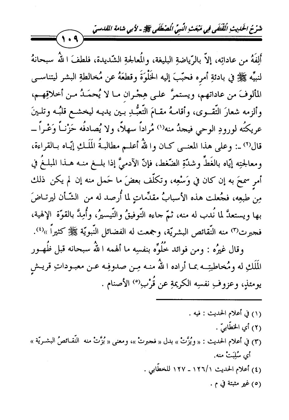 أَلفه من عاداته، إِلَّا بالرياضة البليغة، والمعالجة الشَّدِيدَة، فلطف الله سُبْحَانَهُ لنَبيه - صلى الله عليه وسلم - فِي بادئه أمره فحبب إِلَيْهِ الْخلْوَة وقطعه عَن مُخَالطَة الْبشر ليتناسى المألوف من عاداتهم، وَيسْتَمر على هجران مَا لَا يحمد من أَخْلَاقهم وألزمه شعار التَّقْوَى، وأقامه مقَام التَّعَبُّد بَين يَدَيْهِ ليخشع قلبه وتلين عريكته لوُرُود الْوَحْي فيجد مِنْهُ مرَادا سهلا، وَلَا يصادفه حزنا وعرا - قَالَ -: وعَلى هَذَا الْمَعْنى كَانَ وَالله أعلم مُطَالبَة الْملك إِيَّاه بِالْقِرَاءَةِ ومعالجته إِيَّاه بالغط وَشدَّة الضغط، فَإِن الْآدَمِيّ إِذا بلغ مِنْهُ هَذَا الْمبلغ فِي أَمر سمح بِهِ إِن كَانَ فِي وَسعه، وتكلف بعض مَا حمل مِنْهُ إِن لم يكن ذَلِك من طبعه، فَجعلت هَذِه الْأَسْبَاب مُقَدمَات لما أرصد لَهُ من الشَّأْن ليرتاض بهَا ويستعد لما ندب لَهُ مِنْهُ، ثمَّ جَاءَهُ التَّوْفِيق والتيسير، وأمد بِالْقُوَّةِ الإلهية، فجبرت مِنْهُ النقائص البشرية، وجمعت لَهُ الْفَضَائِل النَّبَوِيَّة - صلى الله عليه وسلم - كثيرا.