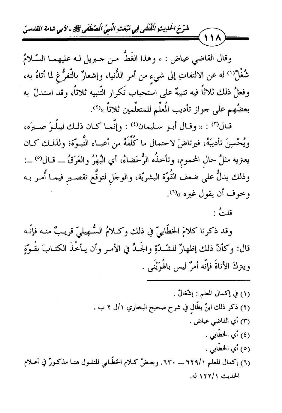 وَقَالَ القَاضِي عِيَاض: " وَهَذَا الغط من جِبْرِيل لَهُ عَلَيْهِمَا السَّلَام شغل لَهُ عَن الِالْتِفَات إِلَى شَيْء من أَمر الدُّنْيَا، وإشعار بالتفرغ لما أَتَاهُ بِهِ، وَفعل ذَلِك ثَلَاثًا فِيهِ تَنْبِيه على اسْتِحْبَاب تكْرَار التَّنْبِيه ثَلَاثًا، وَقد اسْتدلَّ بِهِ بَعضهم على جَوَاز تَأْدِيب الْمعلم للمتعلمين ثَلَاثًا ".