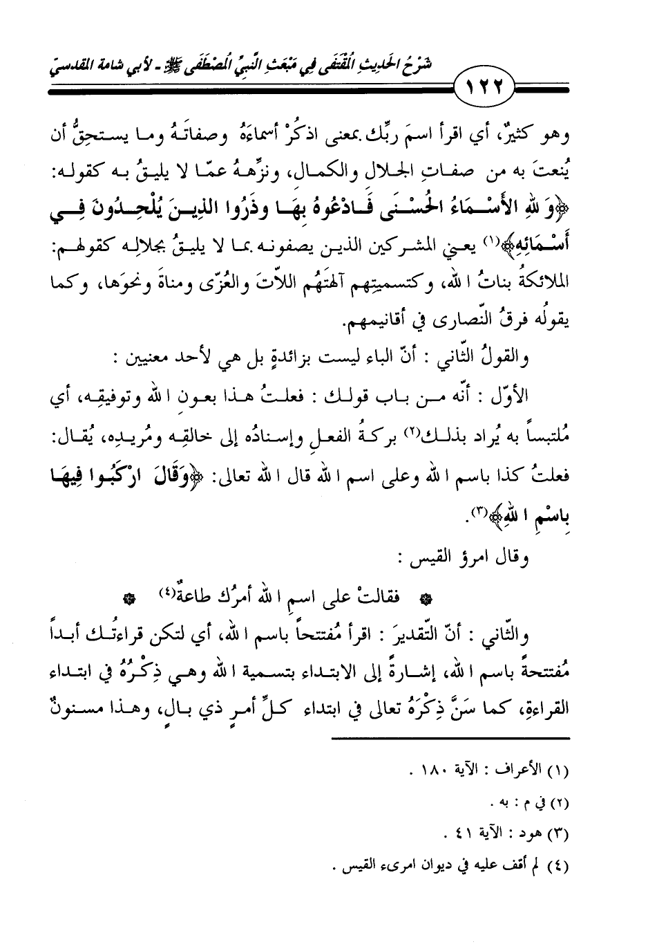 وَالثَّانِي: أَن التَّقْدِير: اقْرَأ مفتتحا باسم الله، أَي لتكن قراءتك أبدا مفتتحة باسم الله، إِشَارَة إِلَى الِابْتِدَاء بِتَسْمِيَة الله وَهِي ذكره فِي ابْتِدَاء الْقِرَاءَة، كَمَا سنّ ذكره تَعَالَى فِي ابْتِدَاء كل أَمر ذِي بَال، وَهَذَا مسنون.
