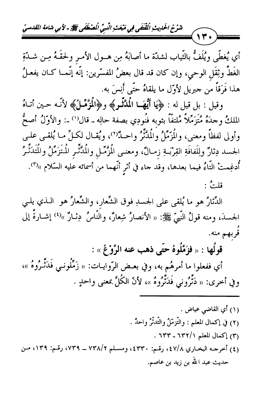 أَي يُغطي ويلف بالثياب لشدَّة مَا أَصَابَهُ من هول الْأَمر ولحقه من شدَّة الغط وَثقل الْوَحْي، وَإِن كَانَ قد قَالَ بعض الْمُفَسّرين: إِنَّه إِنَّمَا كَانَ يفعل هَذِه فرقا من جِبْرِيل لأوّل مَا يلقاه حَتَّى أنس بِهِ.