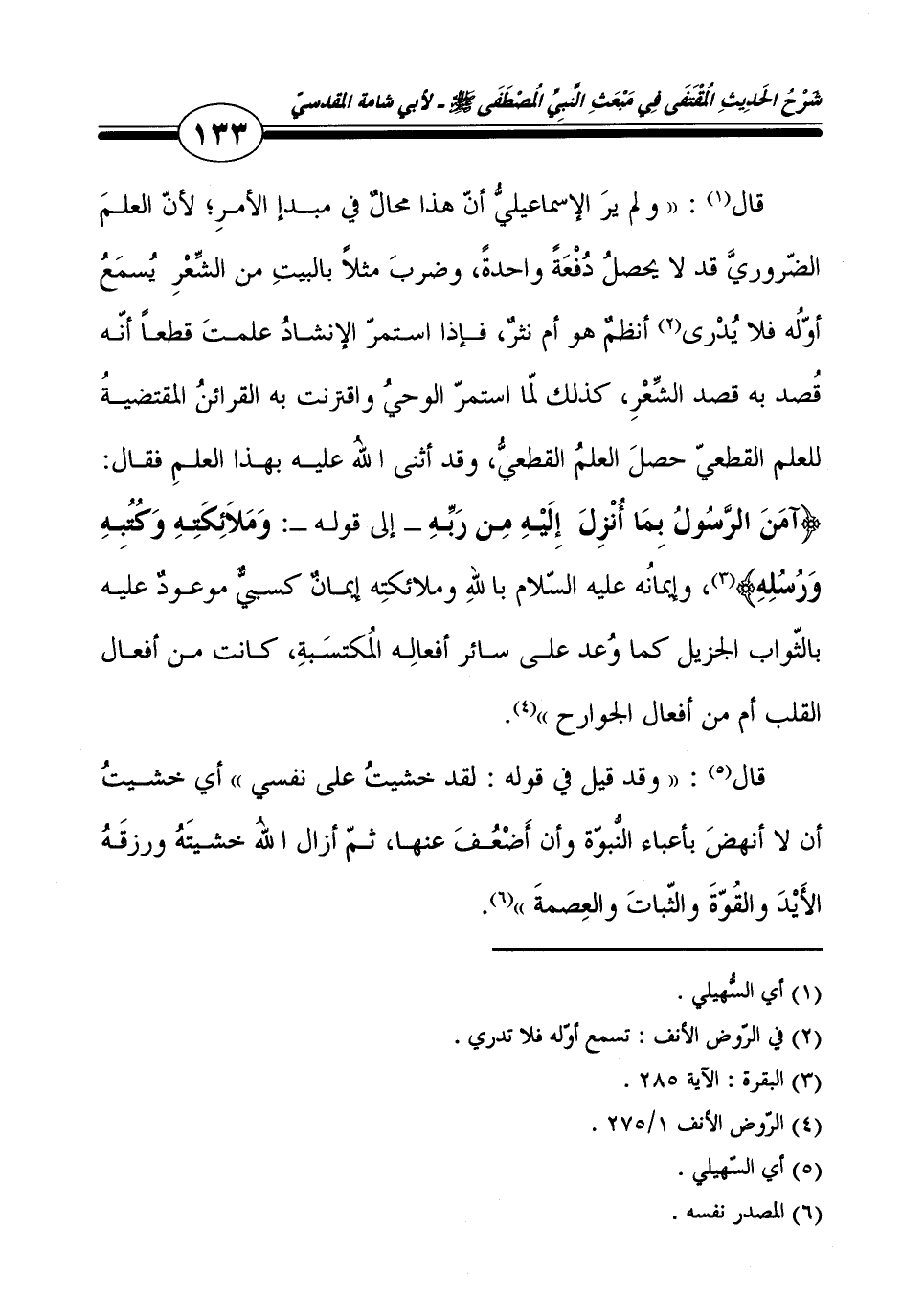 قَالَ: " وَلم ير الْإِسْمَاعِيلِيّ أَن هَذَا محَال فِي مبدأ الْأَمر، لِأَن الْعلم الضَّرُورِيّ قد لَا يحصل دفْعَة وَاحِدَة، وَضرب مثلا بِالْبَيْتِ من الشّعْر يسمع أَوله فَلَا يدرى أنظم هُوَ أم نثر، فَإِذا اسْتمرّ الإنشاد علمت قطعا أَنه قصد بِهِ قصر الشّعْر، كَذَلِك لما اسْتمرّ الْوَحْي واقترنت بِهِ الْقَرَائِن الْمُقْتَضِيَة للْعلم الْقطعِي حصل الْعلم الْقطعِي، وَقد أثنى الله عَلَيْهِ بِهَذَا الْعلم فَقَالَ: {آمن الرَّسُول بِمَا أنزل إِلَيْهِ من ربه - إِلَى قَوْله - وَمَلَائِكَته وَكتبه وَرُسُله} ، وإيمانه عَلَيْهِ السَّلَام بِاللَّه وَمَلَائِكَته إِيمَان كسبي مَوْعُود عَلَيْهِ بالثواب الجزيل كَمَا وعد على سَائِر أَفعاله المكتسبة، كَانَت من أَفعَال الْقلب أم من أَفعَال الْجَوَارِح ".