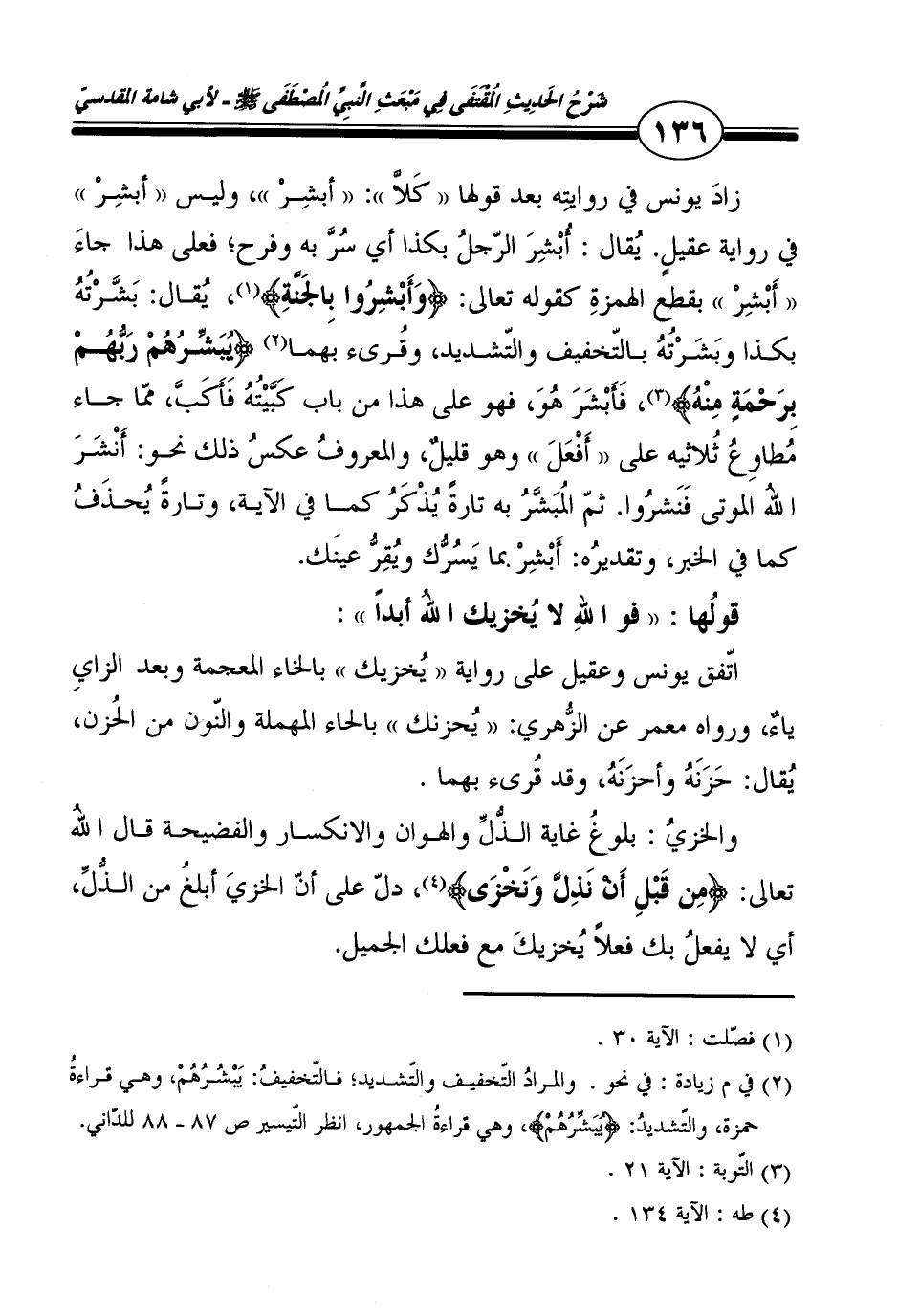 زَاد يُونُس فِي رِوَايَته بعد قَوْلهَا " كلا ": " أبشر "، وَلَيْسَ " أبشر " فِي رِوَايَة عقيل. يُقَال: أبشر الرجل بِكَذَا أَي سر بِهِ وَفَرح، فعلى هَذَا جَاءَ " أبشر " بِقطع الْهمزَة كَقَوْلِه تَعَالَى: {وَأَبْشِرُوا بِالْجنَّةِ} ، يُقَال: بَشرته بِكَذَا وبشرته بِالتَّخْفِيفِ وَالتَّشْدِيد، وَقُرِئَ بهما {يبشرهم رَبهم برحمة مِنْهُ} ، فأبشر هُوَ، فَهُوَ على هَذَا من بَاب كبيته فأكب، مِمَّا جَاءَ مُطَاوع ثلاثيه على " أفعل " وَهُوَ قَلِيل، وَالْمَعْرُوف عكس ذَلِك نَحْو: أنشر الله الْمَوْتَى فنشروا. ثمَّ المبشر بِهِ تَارَة يذكر كَمَا فِي الْآيَة، وَتارَة يحذف كَمَا فِي الْخَبَر، وَتَقْدِيره: أبشر. بِمَا يَسُرك ويقر عَيْنك.