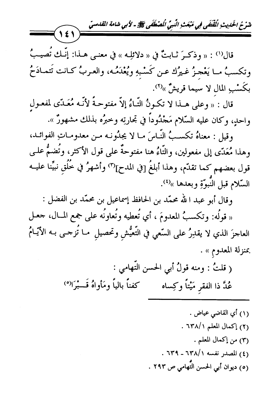 وَقيل: مَعْنَاهُ تكسب النَّاس مَا لَا يجدونه من معدومات الْفَوَائِد، وَهَذَا معدى إِلَى مفعولين، وَالتَّاء هُنَا مَفْتُوحَة على قَول الْأَكْثَر، وتضم على قَول بَعضهم كَمَا تقدم، وَهَذَا أبلغ [فِي الْمَدْح] وَأشهر فِي خلق نَبينَا عَلَيْهِ السَّلَام قبل النُّبُوَّة وَبعدهَا ".