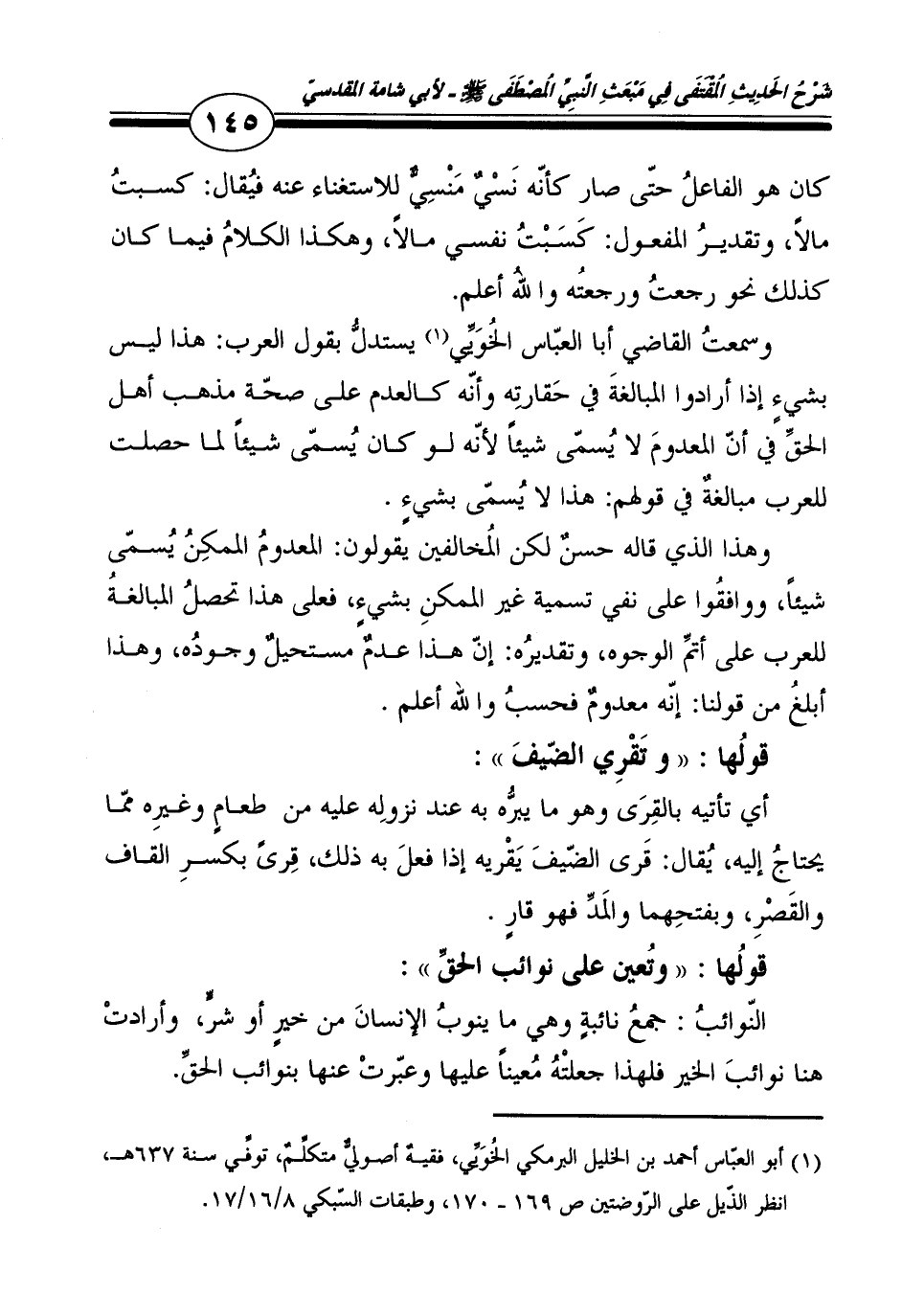وَسمعت القَاضِي أَبَا الْعَبَّاس الخويي يسْتَدلّ بقول الْعَرَب: هَذَا لَيْسَ بِشَيْء إِذا أَرَادوا الْمُبَالغَة فِي حقارته وَأَنه كَالْعدمِ على صِحَة مَذْهَب أهل الْحق فِي أَن الْمَعْدُوم لَا يُسمى شَيْئا لِأَنَّهُ لَو كَانَ يُسمى شَيْئا لما حصلت للْعَرَب مُبَالغَة فِي قَوْلهم: هَذَا لَا يُسمى بِشَيْء.