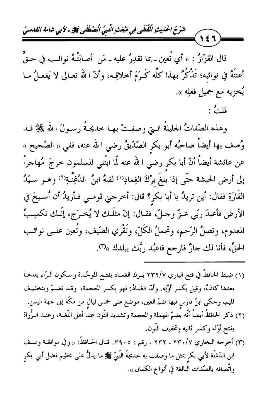 وَهَذِه الصِّفَات الجليلة الَّتِي وصفت بهَا خَدِيجَة رَسُول الله - صلى الله عليه وسلم - قد وصف بهَا أَيْضا صَاحبه أَبُو بكر الصّديق رَضِي الله عَنهُ، فَفِي " الصَّحِيح " عَن عَائِشَة أَيْضا أَن أَبَا بكر رَضِي الله عَنهُ لما ابتلى الْمُسلمُونَ خرج مُهَاجرا إِلَى أَرض الْحَبَشَة حَتَّى إِذا بلغ برك الغماد لقِيه ابْن الدغنة وَهُوَ سيد القارة فَقَالَ: أَيْن تُرِيدُ يَا أَبَا بكر؟ قَالَ: أخرجني قومِي فَأُرِيد أَن أَن أسيح فِي الأَرْض فأعبد رَبِّي عز وَجل، فَقَالَ: إِن مثلك لَا يخرج، إِنَّك تكسب الْمَعْدُوم، وَتصل الرَّحِم، وَتحمل الْكل، وتقري الضَّيْف، وَتعين على نَوَائِب الْحق، فَأَنا لَك جَار فَارْجِع فاعبد رَبك ببلدك ".