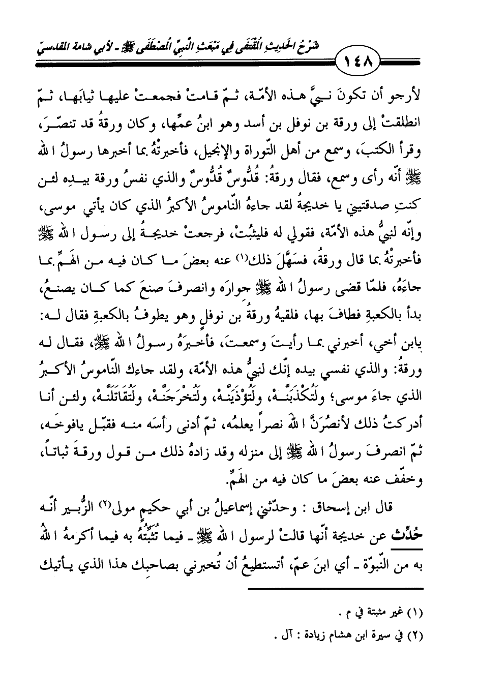 لأرجو أَن تكون نَبِي هَذِه الْأمة، ثمَّ قَامَت فَجمعت عَلَيْهَا ثِيَابهَا، ثمَّ انْطَلَقت إِلَى ورقة بن نَوْفَل بن أَسد وَهُوَ ابْن عَمها، وَكَانَ ورقة قد تنصر، وَقَرَأَ الْكتب، وَسمع من أهل التَّوْرَاة وَالْإِنْجِيل، فَأَخْبَرته بِمَا أخْبرهَا رَسُول الله - صلى الله عليه وسلم - أَنه رأى وَسمع، فَقَالَ ورقة: قدوس قدوس وَالَّذِي نفس ورقة بِيَدِهِ لَئِن كنت صدقتيني يَا خَدِيجَة لقد جَاءَهُ الناموس الْأَكْبَر الَّذِي كَانَ يَأْتِي مُوسَى، وَإنَّهُ لنَبِيّ لهَذِهِ الْأمة، فَقولِي لَهُ فليثبت، فَرَجَعت خَدِيجَة إِلَى رَسُول الله - صلى الله عليه وسلم - فاخبرته بِمَا قَالَ ورقة، فسهل ذَلِك عَنهُ بعض مَا كَانَ فِيهِ من الْهم بِمَا جَاءَهُ، فَلَمَّا قضى رَسُول الله - صلى الله عليه وسلم - جواره وَانْصَرف صنع كَمَا كَانَ يصنع، بَدَأَ بِالْكَعْبَةِ فَطَافَ بهَا، فَلَقِيَهُ ورقة بن نَوْفَل وَهُوَ يطوف بِالْكَعْبَةِ فَقَالَ لَهُ: يَا بن أخي، أَخْبرنِي بِمَا رَأَيْت وَسمعت، فَأخْبرهُ رَسُول الله - صلى الله عليه وسلم -، فَقَالَ لَهُ ورقة: وَالَّذِي نَفسِي بِيَدِهِ أَنَّك لنَبِيّ هَذِه الْأمة، وَلَقَد جَاءَك الناموس الْأَكْبَر الَّذِي جَاءَ مُوسَى، ولتكذبنه، ولتؤذينه، ولتخرجنه، ولتقاتلنه، وَلَئِن أَنا أدْركْت ذَلِك لأنصرن الله نصرا يُعلمهُ، ثمَّ أدنى رَأسه مِنْهُ فَقيل يَافُوخه، ثمَّ انْصَرف رَسُول الله - صلى الله عليه وسلم - إِلَى منزله وَقد زَاده ذَلِك من قَول ورقة ثباتا، وخفف عَنهُ بعض مَا كَانَ فِيهِ من الْهم.
