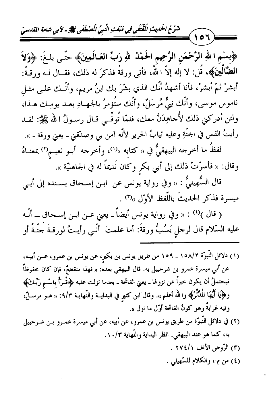 {بِسم الله الرَّحْمَن الرَّحِيم الْحَمد لله رب الْعَالمين} حَتَّى بلغ: {وَلَا الضَّالّين} ، قل: لَا إِلَه إِلَّا الله، فَأتى ورقة فَذكر لَهُ ذَلِك، فَقَالَ لَهُ ورقة: أبشر ثمَّ أبشر، فَأَنا أشهد أَنَّك الَّذِي بشر بك ابْن مَرْيَم، وَأَنَّك على مثل ناموس مُوسَى، وَأَنَّك نَبِي مُرْسل، وَأَنَّك ستؤمر بِالْجِهَادِ بعد يَوْمك هَذَا، وَلَئِن أدركني ذَلِك لأجاهدن مَعَك، فَلَمَّا توفّي قَالَ رَسُول الله - صلى الله عليه وسلم -: لقد رَأَيْت القس فِي الْجنَّة وَعَلِيهِ ثِيَاب الْحَرِير لِأَنَّهُ آمن بِي وصدقني - يَعْنِي ورقة - ".