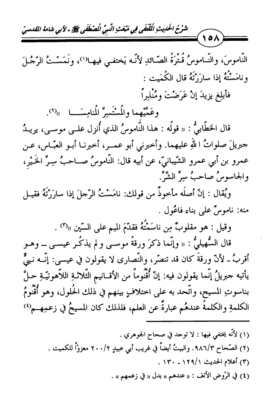 وَقيل: هُوَ مقلوب من ناسمته فَقدم الْمِيم على السِّين ". قَالَ السُّهيْلي: " وَإِنَّمَا ذكر ورقة مُوسَى وَلم يذكر عِيسَى - وَهُوَ أقرب - لِأَن ورقة كَانَ قد تنصر، وَالنَّصَارَى لَا يَقُولُونَ فِي عِيسَى: إِنَّه نَبِي يَأْتِيهِ جِبْرِيل إِنَّمَا يَقُولُونَ فِيهِ: إِن أقنوما من الأقانيم الثَّلَاثَة اللاهوتيه حل بناسوت الْمَسِيح، واتحد بِهِ على اخْتِلَاف بَينهم فِي ذَلِك الْحُلُول، وَهُوَ أقنوم الْكَلِمَة والكلمة عِنْدهم عبارَة عَن الْعلم، فَلذَلِك كَانَ الْمَسِيح فِي زعمهم