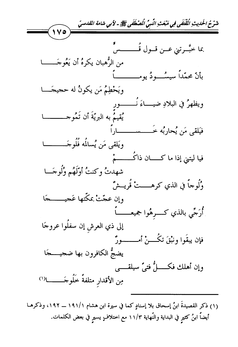 (وَيظْهر فِي الْبِلَاد ضِيَاء نور ... يُقيم بِهِ الْبَريَّة أَن تموجا)