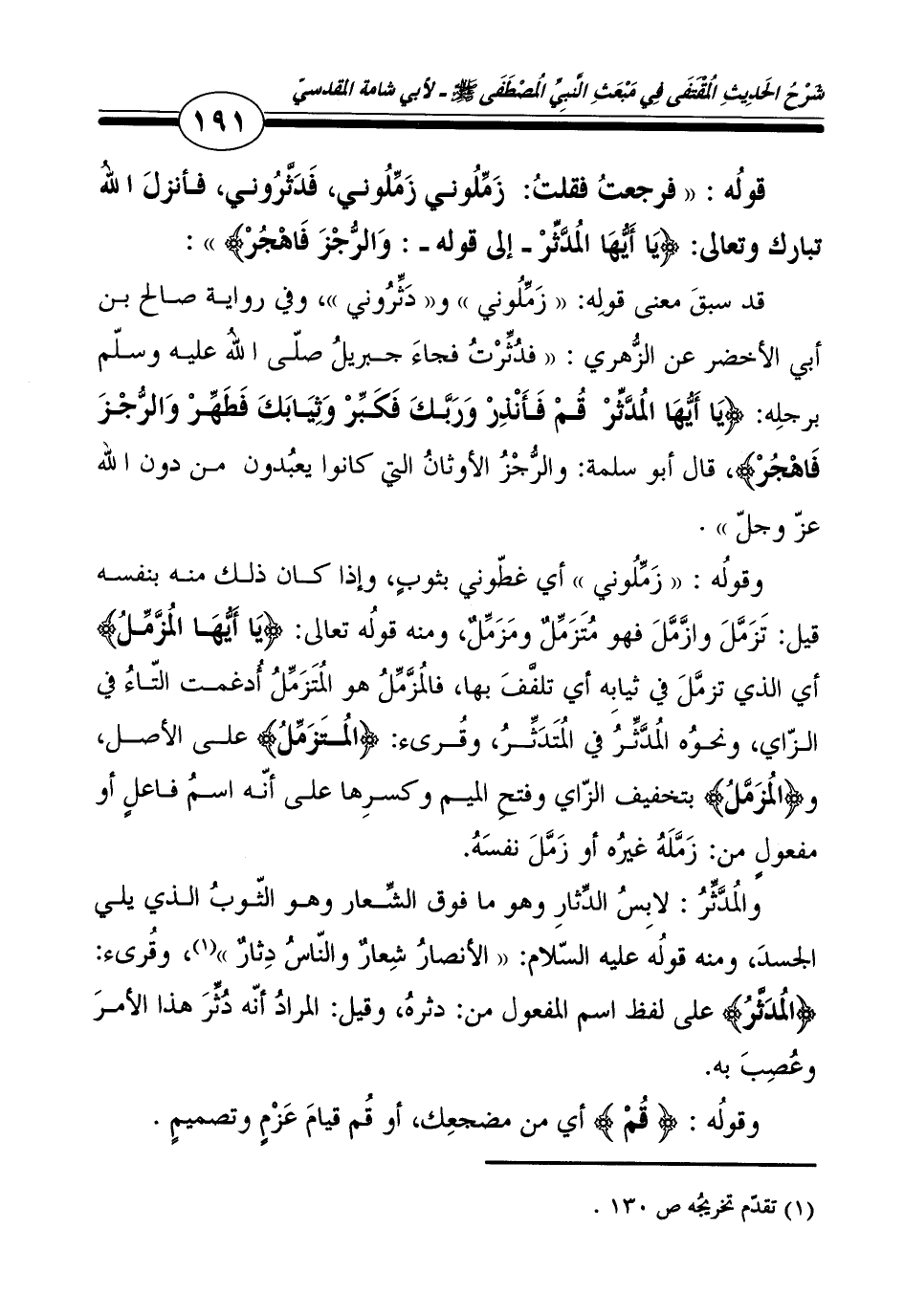 وَقَوله: " زَمِّلُونِي أَي غطوني بِثَوْب، وَإِذا كَانَ ذَلِك مِنْهُ بِنَفسِهِ قيل: تزمل وازمل فَهُوَ متزمل ومزمل، وَمِنْه قَوْله تَعَالَى: {يَا أَيهَا المزمل} أَي الَّذِي تزمل فِي ثِيَابه أَي تلفف بهَا، فالمزمل هُوَ المتزمل أدغمت التَّاء فِي الزَّاي، وَنَحْوه المدثر فِي المتدثر، وَقُرِئَ: {المتزمل} على الأَصْل، و {المزمل} بتَخْفِيف الزَّاي وَفتح الْمِيم وَكسرهَا على أَنه اسْم فَاعل أَو مفعول من: زمله غَيره أَو زمل نَفسه.