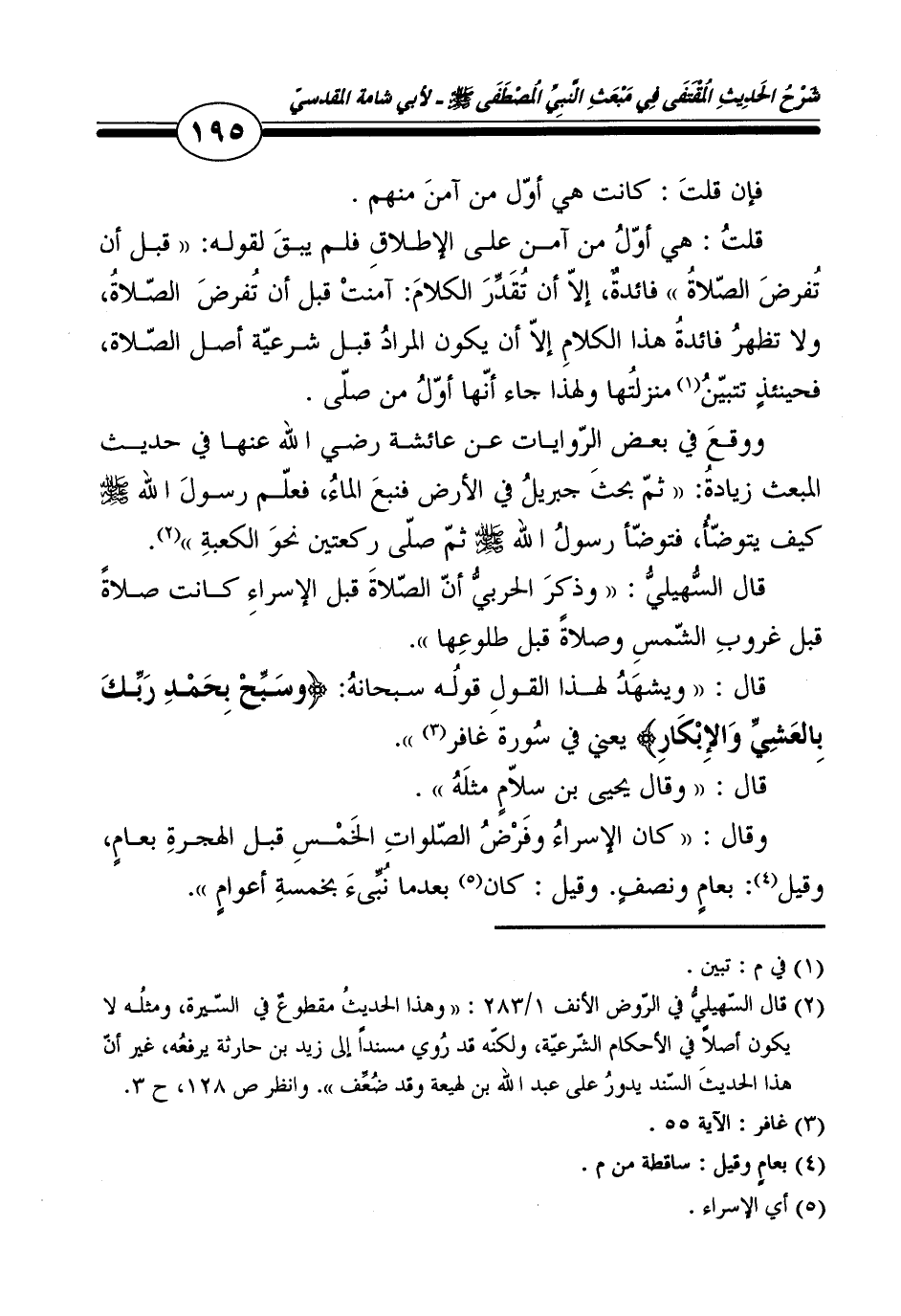 قَالَ السُّهيْلي: " وَذكر الْحَرْبِيّ أَن الصَّلَاة قبل الْإِسْرَاء كَانَت صَلَاة قبل غرُوب الشَّمْس وَصَلَاة قبل طُلُوعهَا ".