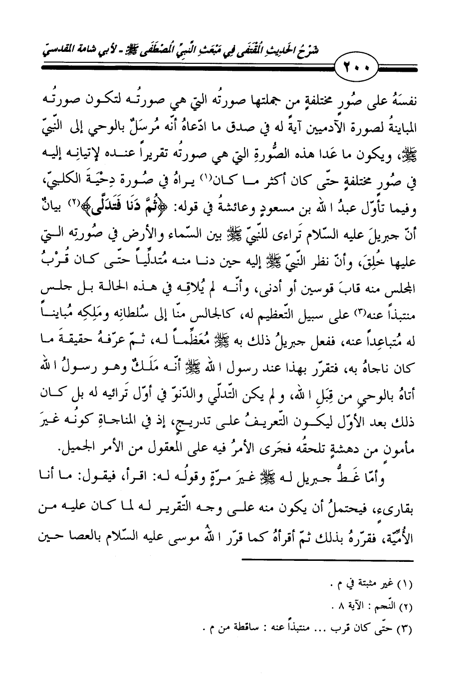 نَفسه على صور مُخْتَلفَة من جُمْلَتهَا صورته الَّتِي هِيَ صورته لتَكون صورته المباينة لصورة الْآدَمِيّين آيَة لَهُ فِي صدق مَا ادَّعَاهُ أَنه مُرْسل بِالْوَحْي إِلَى النَّبِي - صلى الله عليه وسلم -، وَيكون مَا عدا هَذِه الصُّورَة الَّتِي هِيَ صورته تقريرا عِنْده لإتيانه إِلَيْهِ فِي صور مُخْتَلفَة حَتَّى كَانَ أَكثر مَا كَانَ يرَاهُ فِي صُورَة دحْيَة الْكَلْبِيّ، وَفِيمَا تَأَول عبد الله بن مَسْعُود وَعَائِشَة فِي قَوْله: {ثمَّ دنا فَتَدَلَّى} بَيَان أَن جِبْرِيل عَلَيْهِ السَّلَام ترَاءى للنَّبِي - صلى الله عليه وسلم - بَين السَّمَاء وَالْأَرْض فِي صورته الَّتِي عَلَيْهَا خلق، وَأَن نظر النَّبِي - صلى الله عليه وسلم - إِلَيْهِ حِين دنا مِنْهُ متدليا حَتَّى كَانَ قرب الْمجْلس مِنْهُ قاب قوسين أَو أدنى، وَأَنه لم يلاقه فِي هَذِه الْحَالة بل جلس منتبذا عَنهُ على سَبِيل التَّعْظِيم لَهُ، كالجالس منا إِلَى سُلْطَانه وَملكه مباينا لَهُ متباعدا عَنهُ، فَفعل جِبْرِيل ذَلِك بِهِ - صلى الله عليه وسلم - مُعظما لَهُ، ثمَّ عرفه حَقِيقَة مَا كَانَ ناجاه بِهِ، فتقرر بِهَذَا عِنْد رَسُول الله - صلى الله عليه وسلم - أَنه ملك وَهُوَ رَسُول الله أَتَاهُ بِالْوَحْي من قبل الله، وَلم يكن التدلي والدنو فِي أول ترائيه لَهُ بل كَانَ ذَلِك بعد الأول ليَكُون التَّعْرِيف على تدريج، إِذْ فِي الْمُنَاجَاة كَونه غير مَأْمُون من دهشة تلْحقهُ فَجرى الْأَمر فِيهِ على الْمَعْقُول من الْأَمر الْجَمِيل.