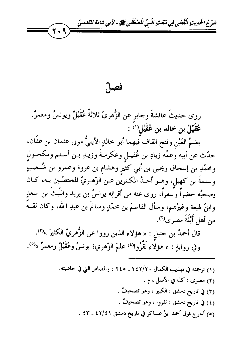 بِضَم الْعين وَفتح الْقَاف فيهمَا أَبُو خَالِد الْأَيْلِي مولى عُثْمَان بن عَفَّان، حدث عَن أَبِيه وَعَمه زِيَاد بن عقيل وَعِكْرِمَة وَزيد بن أسلم وَمَكْحُول وَمُحَمّد بن إِسْحَاق وَيحيى بن أبي كثير وَهِشَام بن عُرْوَة وَعَمْرو بن شُعَيْب وَسَلَمَة بن كهيل، وَهُوَ أحد المكثرين عَن الزُّهْرِيّ المختصين بِهِ، كَانَ يَصْحَبهُ حضرا وسفرا، روى عَنهُ من أقرانه يُونُس بن يزِيد وَاللَّيْث بن سعد وَابْن لَهِيعَة وَغَيرهم، وَسَأَلَ الْقَاسِم بن مُحَمَّد وَسَالم بن عبد الله، وَكَانَ ثِقَة من أهل أَيْلَة مصري.