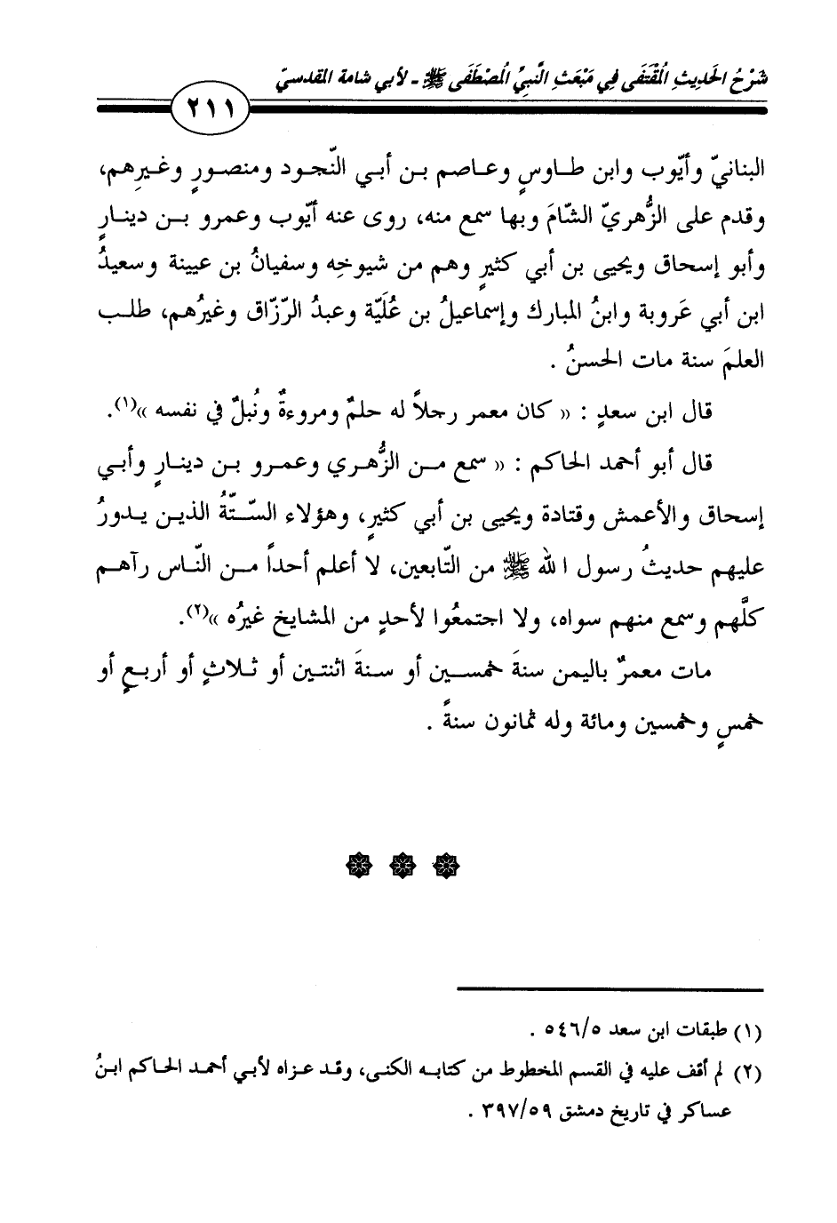 قَالَ ابْن سعد: " كَانَ معمر رجلا لَهُ حلم ومروءة ونبل فِي نَفسه ".
