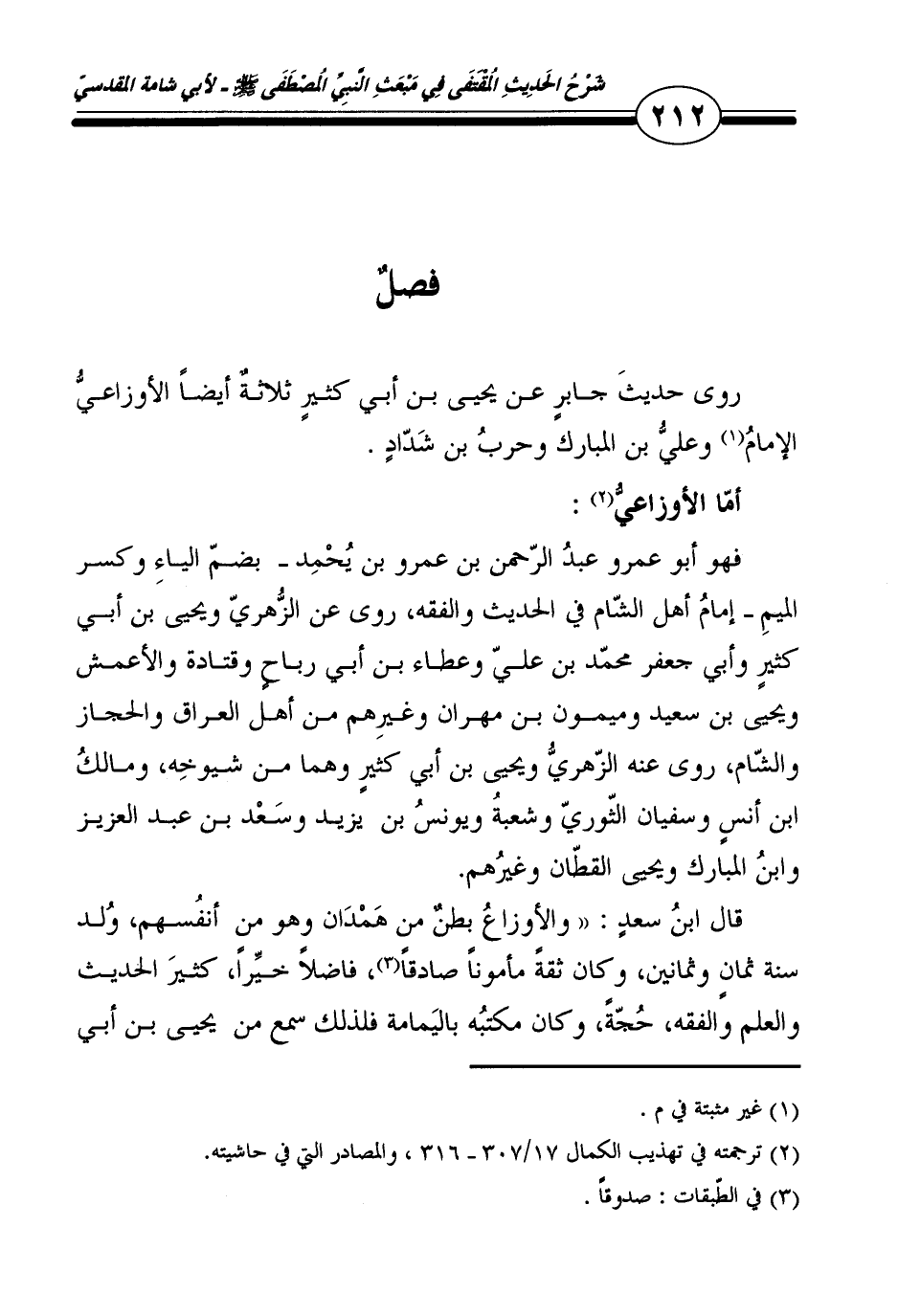 فَهُوَ أَبُو عَمْرو عبد الرَّحْمَن بن عَمْرو بن يحمد - بِضَم الْيَاء وَكسر الْمِيم - إِمَام أهل الشَّام فِي الحَدِيث وَالْفِقْه، روى عَن الزُّهْرِيّ وَيحيى بن أبي كثير وَأبي جَعْفَر مُحَمَّد بن عَليّ وَعَطَاء بن أبي رَبَاح وَقَتَادَة وَالْأَعْمَش وَيحيى بن سعيد وَمَيْمُون بن مهْرَان وَغَيرهم من أهل الْعرَاق والحجاز وَالشَّام، روى عَنهُ الزُّهْرِيّ وَيحيى بن أبي كثير وهما من شُيُوخه، وَمَالك ابْن أنس وسُفْيَان الثَّوْريّ وَشعْبَة وَيُونُس بن يزِيد وَسعد بن عبد الْعَزِيز وَابْن الْمُبَارك وَيحيى الْقطَّان وَغَيرهم.