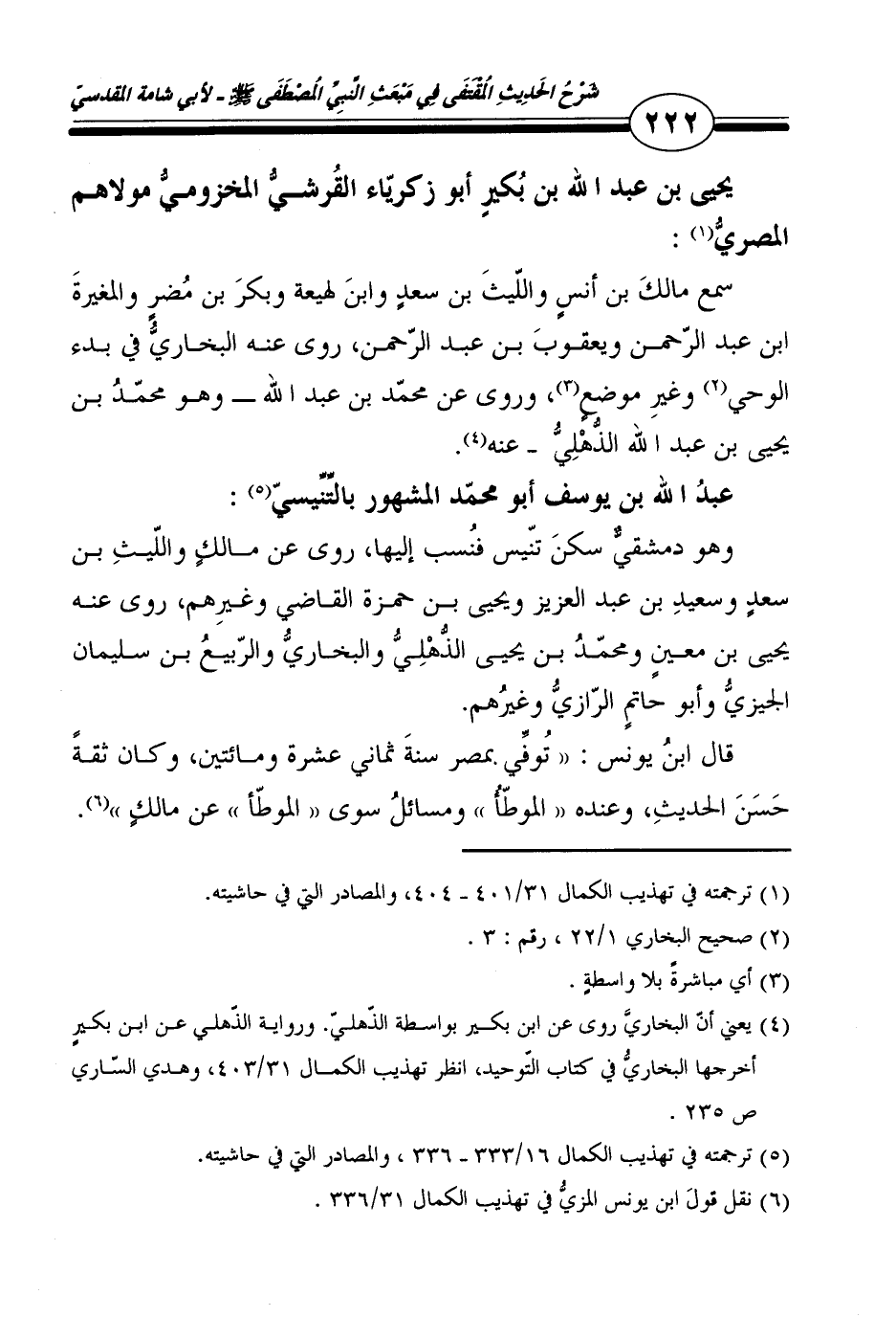 وَهُوَ دمشقي سكن تنيس فنسب إِلَيْهَا، روى عَن مَالك وَاللَّيْث بن سعد وَسَعِيد بن عبد الْعَزِيز وَيحيى بن حَمْزَة القَاضِي وَغَيرهم، روى عَنهُ يحيى بن معِين وَمُحَمّد بن يحيى الذهلي وَالْبُخَارِيّ وَالربيع بن سُلَيْمَان الجيزي وَأَبُو حَاتِم الرَّازِيّ وَغَيرهم ".