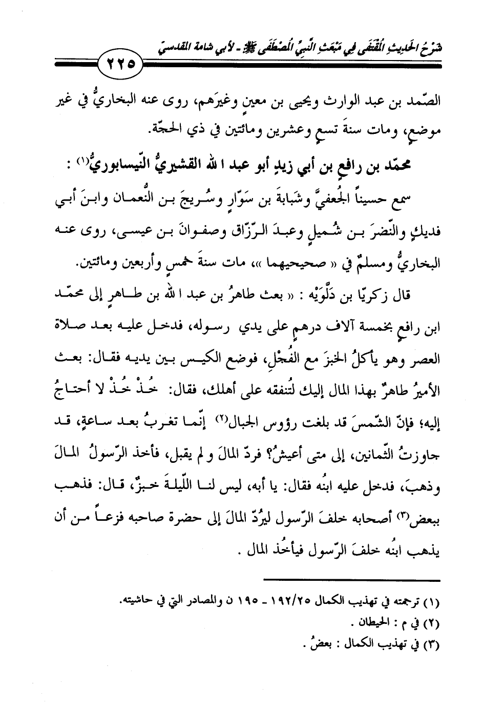 سمع حُسَيْنًا الْجعْفِيّ وشبابة بن سوار وسريج بن النُّعْمَان وَابْن أبي فديك وَالنضْر بن شُمَيْل وَعبد الرَّزَّاق وَصَفوَان بن عِيسَى، روى عَنهُ البُخَارِيّ وَمُسلم فِي " صَحِيحهمَا، مَاتَ سنة خمس وَأَرْبَعين وَمِائَتَيْنِ.