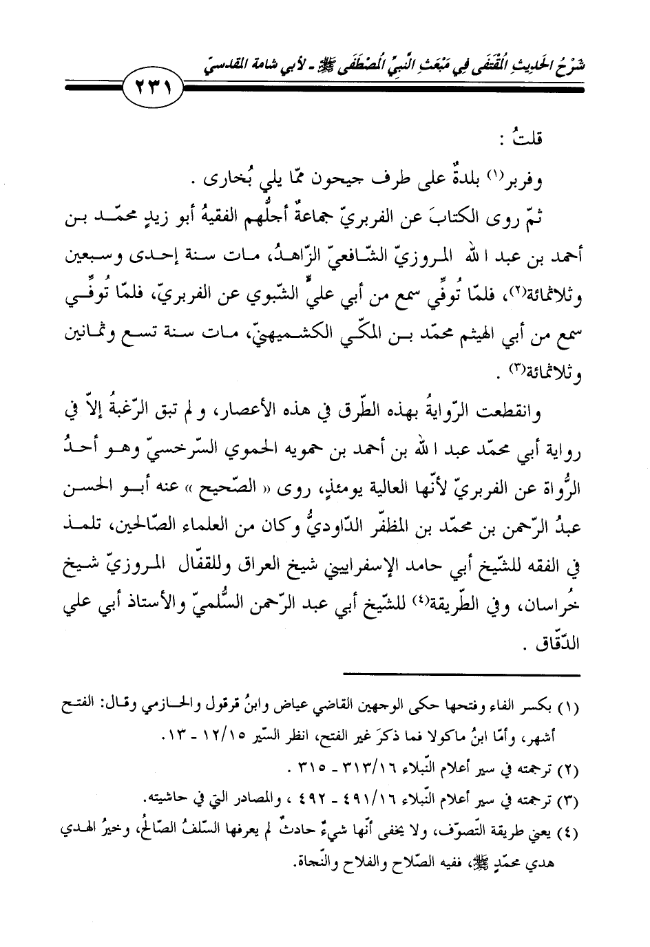 وانقطعت الرِّوَايَة بِهَذِهِ الطّرق فِي هَذِه الْأَعْصَار، وَلم تبْق الرَّغْبَة إِلَّا فِي رِوَايَة أبي مُحَمَّد عبد الله بن أَحْمد بن حمويه الْحَمَوِيّ السَّرخسِيّ وَهُوَ أحد الروَاة عَن الْفربرِي لِأَنَّهَا الْعَالِيَة يَوْمئِذٍ، روى " الصَّحِيح " عَنهُ أَبُو الْحسن عبد الرَّحْمَن بن مُحَمَّد بن المظفر الدَّاودِيّ وَكَانَ من الْعلمَاء الصَّالِحين، تلمذ فِي الْفِقْه للشَّيْخ أبي حَامِد الإِسْفِرَايِينِيّ شيخ الْعرَاق وللقفال الْمروزِي شيخ خُرَاسَان، وَفِي الطَّرِيقَة للشَّيْخ أبي عبد الرَّحْمَن السّلمِيّ والأستاذ أبي عَليّ الدقاق.