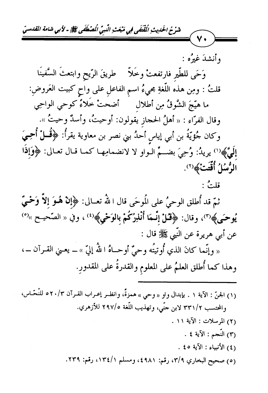 ثمَّ قد أطلق الْوَحْي على الموحى قَالَ الله تَعَالَى: {إِن هُوَ وَحي يُوحى} ، وَقَالَ: {قل إِنَّمَا أنذركم بِالْوَحْي} ، وَفِي " الصَّحِيح " عَن أبي هُرَيْرَة عَن النَّبِي - صلى الله عليه وسلم - قَالَ: