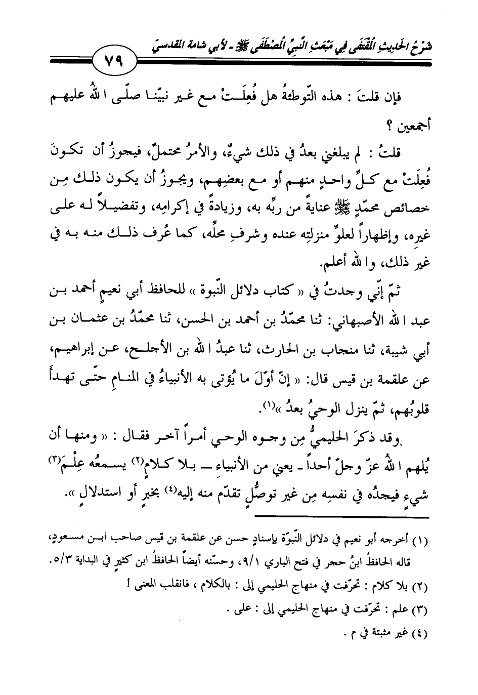 ثن إِنِّي وجدت فِي " كتاب دَلَائِل النُّبُوَّة " لِلْحَافِظِ أبي نعيم أَحْمد بن عبد الله الْأَصْبَهَانِيّ: ثَنَا مُحَمَّد بن أَحْمد بن الْحسن، ثَنَا مُحَمَّد بن عُثْمَان بن أبي شيبَة، ثَنَا منْجَاب بن الْحَارِث، ثَنَا عبد الله بن الْأَجْلَح، عَن إِبْرَاهِيم، عَن عَلْقَمَة بن قيس قَالَ: " إِن أول مَا يُؤْتى بِهِ الْأَنْبِيَاء فِي الْمَنَام حَتَّى تهدأ قُلُوبهم، ثمَّ ينزل الْوَحْي بعد ".