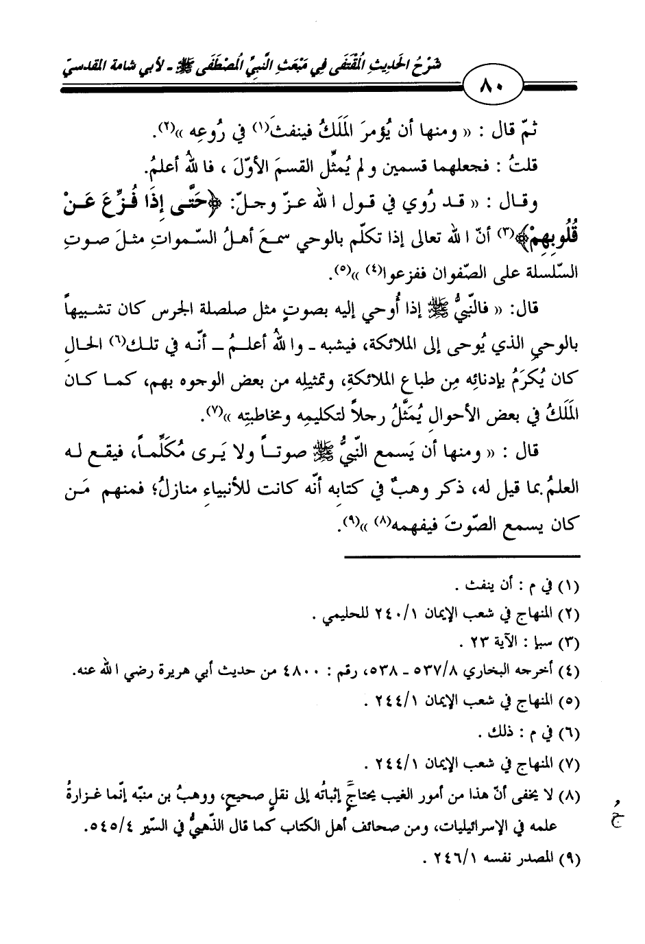 قَالَ: " فالنبي - صلى الله عليه وسلم - إِذا أُوحِي إِلَيْهِ بِصَوْت مثل صلصلة الجرس كَانَ تَشْبِيها بِالْوَحْي الَّذِي يُوحى إِلَى الْمَلَائِكَة، فَيُشبه - وَالله أعلم - أَنه فِي تِلْكَ الْحَال كَانَ يكرم بإدنائه من طباع الْمَلَائِكَة، وتمثيله من بعض الْوُجُوه بهم، كَمَا كَانَ الْملك فِي بعض الْأَحْوَال يمثل رجلا لتكليمه ومخاطبته ".