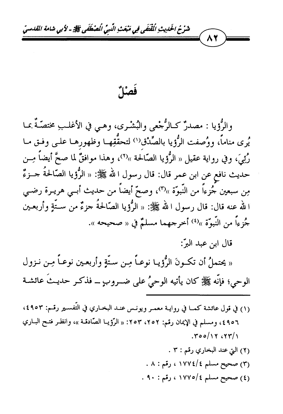 والرؤيا: مصدر كالرجعى والبشرى، وَهِي فِي الْأَغْلَب مُخْتَصَّة بِمَا يرى مناما، ووصفت الرُّؤْيَا بِالصّدقِ لتحققها وظهورها على وفْق مَا رئي، وَفِي رِوَايَة عقيل " الرُّؤْيَا الصَّالِحَة "، وَهَذَا مُوَافق لما صَحَّ أَيْضا من حَدِيث نَافِع عَن ابْن عمر قَالَ: قَالَ رَسُول الله - صلى الله عليه وسلم -: " الرُّؤْيَا الصَّالِحَة جُزْء من سبعين جُزْءا من النُّبُوَّة ". وَصَحَّ أَيْضا من حَدِيث أبي هُرَيْرَة رَضِي الله عَنهُ قَالَ: قَالَ رَسُول الله - صلى الله عليه وسلم -: " الرُّؤْيَا الصَّالِحَة جُزْء من سِتَّة وَأَرْبَعين جُزْءا من النُّبُوَّة ". أخرجهُمَا مُسلم فِي " صَحِيحه ".