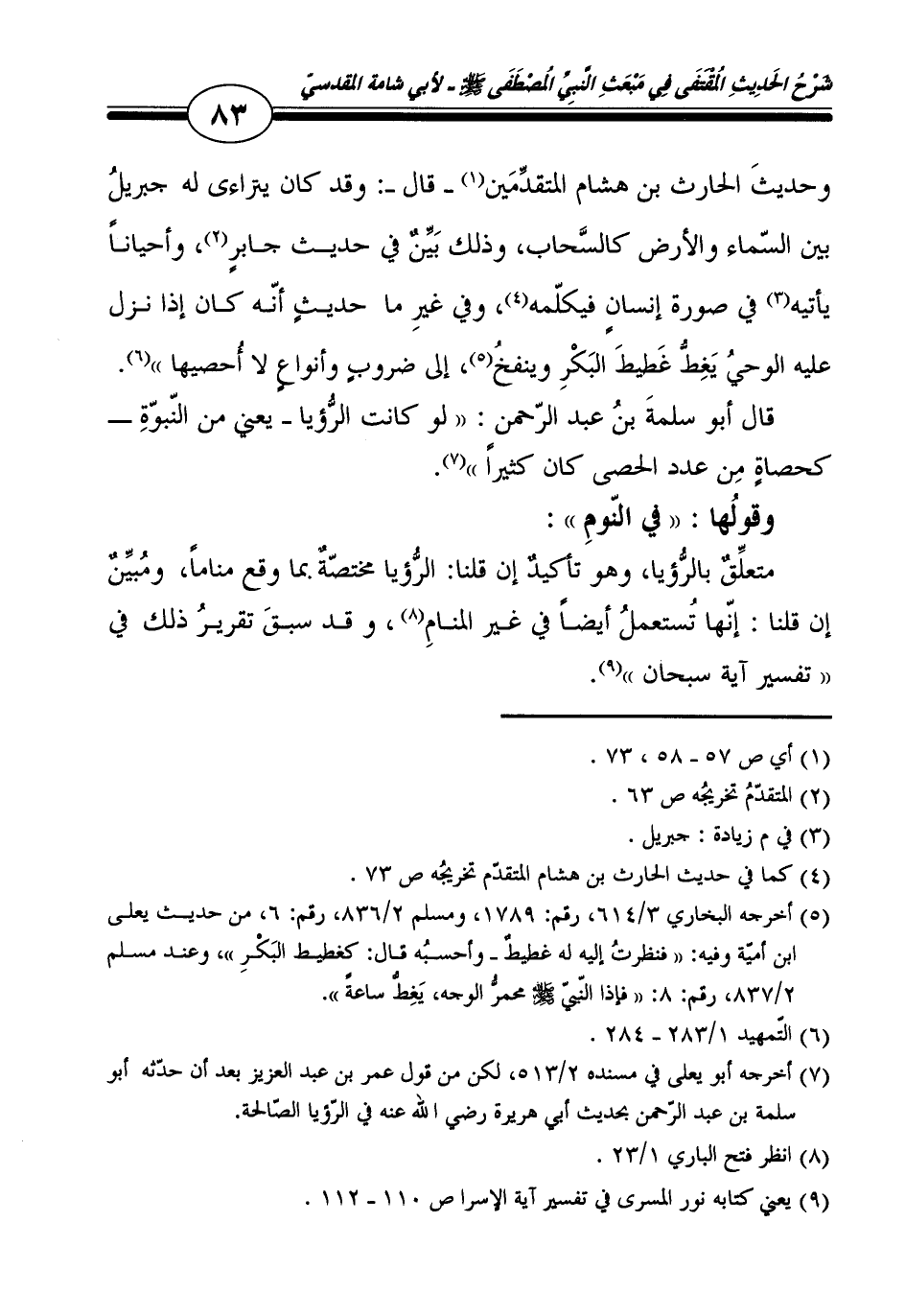 وَحَدِيث الْحَارِث بن هِشَام الْمُتَقَدِّمين - قَالَ -: وَقد كَانَ يتَرَاءَى لَهُ جِبْرِيل بَين السَّمَاء وَالْأَرْض كالسحاب، وَذَلِكَ بَين فِي حَدِيث جَابر، وَأَحْيَانا يَأْتِيهِ فِي صُورَة إِنْسَان فيكلمه، وَفِي غير مَا حَدِيث أَنه كَانَ إِذا نزل عَلَيْهِ الْوَحْي يغط غطيط الْبكر وينفخ، إِلَى ضروب وأنواع لَا أحصيها.