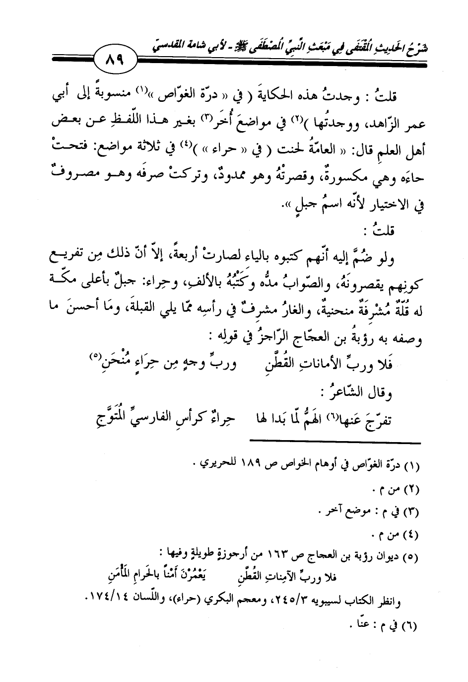 قلت: وجدت هَذِه الْحِكَايَة (فِي " درة الغواص " منسوبة إِلَى أبي عمر الزَّاهِد، ووجدتها) فِي مَوَاضِع أخر بِغَيْر هَذَا اللَّفْظ عَن بعض أهل الْعلم قَالَ: " الْعَامَّة لحنت (فِي " حراء ") فِي ثَلَاثَة مَوَاضِع: فتحت حاءه وَهِي مَكْسُورَة، وقصرته وَهُوَ مَمْدُود، وَتركت صرفه وَهُوَ مَصْرُوف فِي الِاخْتِيَار لِأَنَّهُ اسْم جبل ".