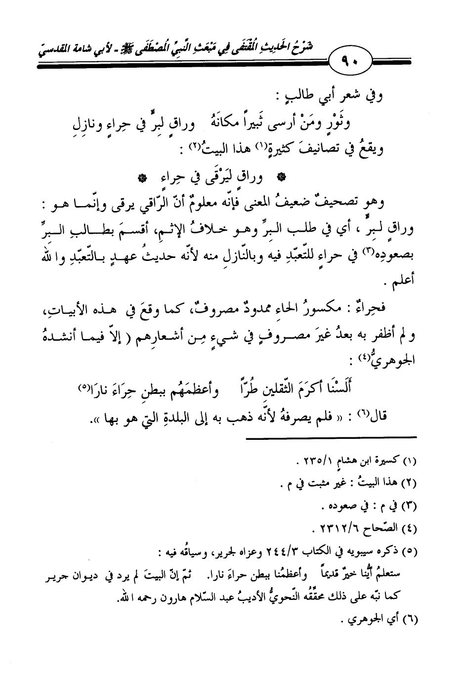 فحراء: مكسور الْحَاء مَمْدُود مَصْرُوف كَمَا وَقع فِي هَذِه الأبيات، وَلم أظفر بِهِ بعد غير مَصْرُوف فِي شَيْء من اشعارهم (إِلَّا فِيمَا أنْشدهُ الْجَوْهَرِي: