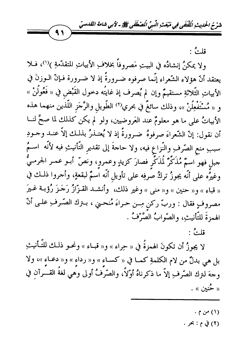 وَلَا يُمكن إنشاده فِي الْبَيْت مصروفا بِخِلَاف الأبيات الْمُتَقَدّمَة) ، فَلَا يعْتَقد أَن هَؤُلَاءِ الشُّعَرَاء إِنَّمَا صرفوه ضَرُورَة إِذْ لَا ضَرُورَة فَإِن الْوَزْن فِي الأبيات الثَّلَاثَة مُسْتَقِيم وَأَن لم يصرف إِذْ غَايَته دُخُول الْقَبْض فِي " فعولن " و " مستفعلن "، وَذَلِكَ سَائِغ فِي بحري الطَّوِيل وَالرجز اللَّذين مِنْهُمَا هَذِه الأبيات على مَا هُوَ مَعْلُوم عِنْد العروضيين، وَلَو لم يكن كَذَلِك لما صَحَّ لنا أَن نقُول: إِن الشُّعَرَاء صرفوه ضَرُورَة إِذْ لَا يعْتَذر بذلك إِلَّا عِنْد وجود سَبَب منع الصّرْف والنزاع فِيهِ، وَلَا حَاجَة إِلَى تَقْدِير التَّأْنِيث فِيهِ لِأَنَّهُ اسْم جبل فَهُوَ اسْم مُذَكّر لمذكر فَصَارَ كزيد وَعَمْرو، وَنَصّ أَبُو عَمْرو الْجرْمِي وَغَيره على أَنه يجوز ترك صرفه على تَأْوِيل أَنه اسْم لبقعة، وأجروا ذَلِك فِي " قبَاء " و " حنين " و " منى " وَغير ذَلِك، وَأنْشد الْقَزاز رجز رؤبة غير مَصْرُوف فَقَالَ: وَرب ركن من حراء منحني، بترك الصّرْف على أَن الْهمزَة للتأنيث، وَالصَّوَاب الصّرْف.