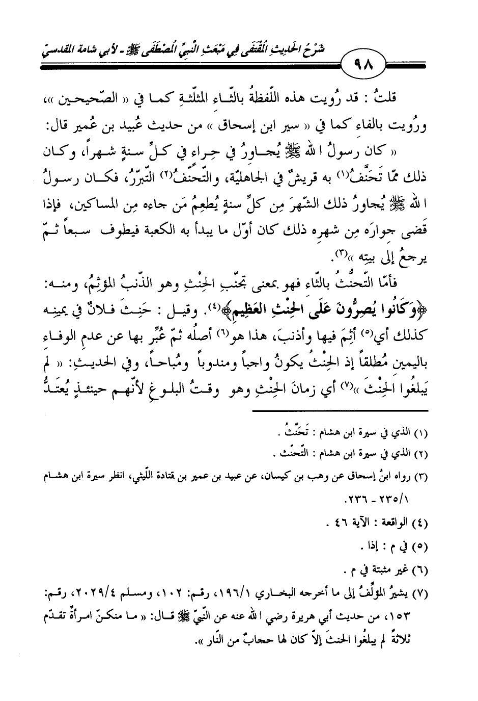 فَأَما التحنث بالثاء فَهُوَ بِمَعْنى تجنب الْحِنْث وَهُوَ الذَّنب المؤثم وَمِنْه: {وَكَانُوا يصرون على الْحِنْث الْعَظِيم} وَقيل: حنث فلَان فِي يَمِينه كَذَلِك أَي أَثم فِيهَا وأذنب، هَذَا هُوَ أَصله ثمَّ عبر بهَا عَن عدم الْوَفَاء بِالْيَمِينِ مُطلقًا إِذْ الْحِنْث يكون وَاجِبا ومندوبا ومباحا، وَفِي الحَدِيث: " لم يبلغُوا الْحِنْث " أَي زمَان الْحِنْث وَهُوَ وقتت الْبلُوغ لأَنهم حِينَئِذٍ يعْتد