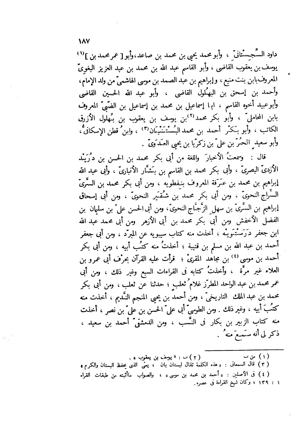 قال: وسمعتُ الأخبارَ واللغة من أبي بكر محمد بن الحسن بن دُرَيد الأزديّ البصريّ، وأبي بكر محمد بن القاسم بن بَشَّار الأنباري، وأبي عبد الله إبراهيم بن محمد بن عَرَفة المعروف بنِفطويه، ومن أبي بكر محمد بن السَّرِيّ السّرّاج النحوي، ومن أبي بكر محمد بن شُقَير النحوي، ومن أبي إسحاق إبراهيم بن السري بن سهل الزجاج النحوي، ومن أبي الحسن علي بن سليمان بن الفضل الأخفش، ومن أبي بكر محمد بن أبي الأزهر، ومن أبي محمد عبد الله بن جعفر بن دَرَسْتَوَيْهِ؛ أخذتُ منه كتاب سيبويه عن المبرد، ومن أبي جعفر أحمد بن عبد الله بن مسلم بن قتيبة؛ أخذتُ منه كُتب أبيه، ومن أبي بكر أحمد بن موسى بن مجاهد المقرئ؛ قرأتُ عليه القرآن بحرْف أبي عمرو بن العلاء غيرَ مرَّةٍ، وأخذتُ كتابه في القراءات السبع وغير ذلك، ومن أبي عمر محمد بن عبد الواحد المطرّز غلام ثعلب؛ حدثنا عن ثعلب، ومن أبي بكر محمد بن عبد الملك التاريخي، ومن أحمد بن يحيى المنجم النَّديم، أخذتُ منه كُتب أبيه، وغير ذلك. ومن الطوسي أبي علي الحسن بن علي بن نصر، أخذت منه كتاب الزبير بن بكار في النسب، ومن الدمشقي أحمد بن سعيد، ذكر لي أنه سمع منه.