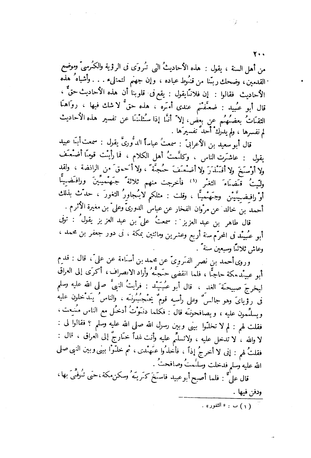 من أهل السُّنَّةِ يقول: هذه الأحاديثُ الَّتي تُروى في الرُّؤية، والكُرسيِّ، وموضعِ القدمين، وضحك ربِّنا من قنوطِ عباده، وإنَّ جهنمَ لتمتلئ ... وأشباهُ هذه الأحاديث. فقالوا: إنَّ فلانًا يقول: يقع في قلوبنا أنَّ هذه الأحاديث حقٌّ. قال أبو عبيد: ضعَّفتم عندي أمرَه، هذه حقٌّ لا شكَّ فيها، رواها الثقاتُ بعضهم عن بعض، إلَّا أنَّا إذا سُئِلنا عن تفسير هذه الأحاديث لم نُفسِّرْها، ولم يدرك أحدٌ تفسيرَها.