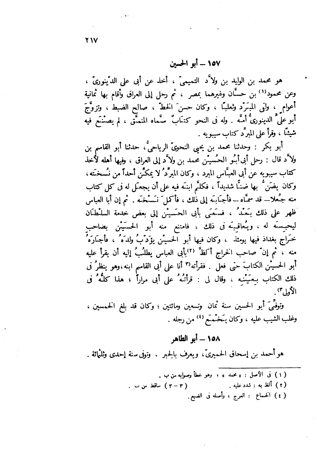 أبو بكر: وحدثنا محمد بن يحيى النحوي الرياحي، حدثنا أبو القاسم بن ولَّادٍ قال: رحل أبي أبو الحسين محمد بن ولَّاد إلى العراق -وفيها أهله- لأخذ كتاب سيبويه عن أبي العباس المبرد، وكان المبرّد لا يُمكِّن أحدًا من نُسخَتِه، وكان يَضَنُّ بها ضَنًّا شديدًا، فكلَّم ابنَه فيه على أن يجعل له في كل كتاب منه جُعلًا قد سمَّاه، فأجابه إلى ذلك، فأكمل نسخَه. ثمَّ إنَّ أبا العباس ظهر على ذلك بعدُ، فسعى بأبي الحسين إلى بعض خدمة السُّلطان ليحبسه له، ويعاقبه في ذلك، فامتنع منه أبو الحسين بصاحب خراج بغداذ فيها يومئذ، وكان فيها أبو الحسين يُؤدِّب ولده، فأجاره منه، ثمَّ إنَّ صاحب الخراج أَلَظَّ بأبي العباس يطلب إليه أن يقرأ عليه أبو الحسين الكتاب، حتى فعل. فقرأتُه أنا على أبي القاسم ابنه، وهو ينظرُ في ذلك الكتاب بعينه، وقال لي: قرأتُه على أبي مرارًا؛ هذا كله في الأولى.