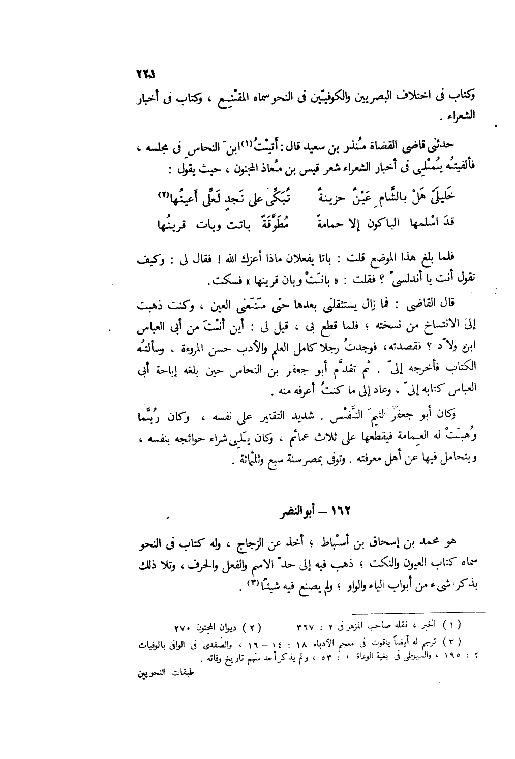 حدثني قاضي القضاة منذر بن سعيد قال: أتيتُ ابنَ النحاس في مجلسه، فألفيتُه يملي في أخبار الشعراء شعر قيس بن معاذ المجنون، حيث يقول: