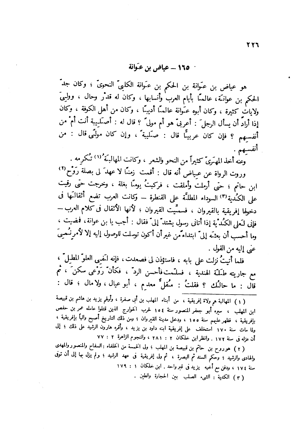 هو عياض بن عَوانة بن الحكم بن عوانة الكلبي النحوي؛ وكان جد الحكم بن عوانة، عالمًا بأيام العرب وأنسابها، وكان له قدر وحال، ووَلِي ولاياتٍ كثيرةً، وكان أبوه عوانة عالمًا أديبًا، وكان من أهل الكوفة، وكان إذا أراد أن يسأل الرجل: أعربي هو أم مولى؟ قال له: أصليبة أنت أم من أنفسهم؟ فإن كان عربيًّا قال: "صليبة"، وإن كان مولًى قال: من أنفسهم.