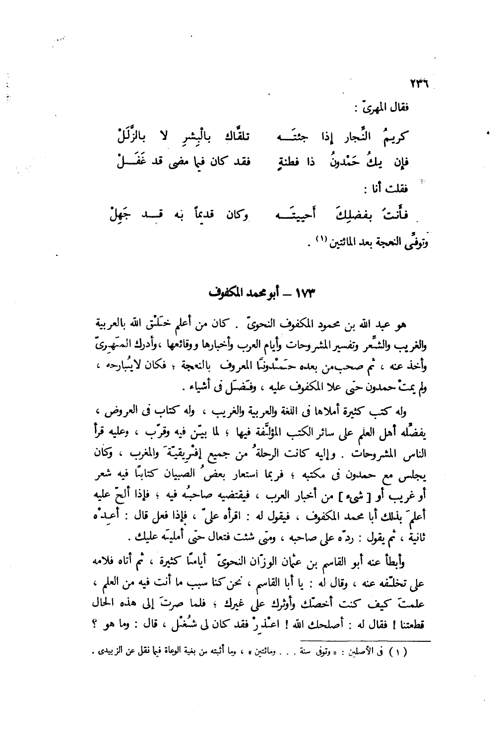هو عبد الله بن محمود المكفوف النحوي. كان من أعلم خَلْق الله بالعربية والغريب والشعر وتفسير المشروحات وأيام العرب وأخبارها ووقائعها، وأدرك المهريَّ وأخذ عنه، ثم صحب من بعده حمدونًا المعروف بالنَّعجةِ، فكان لا يُبارحه، ولم يمتْ حمدون حتى علا المكفوف عليه، وفَضَل في أشياء.