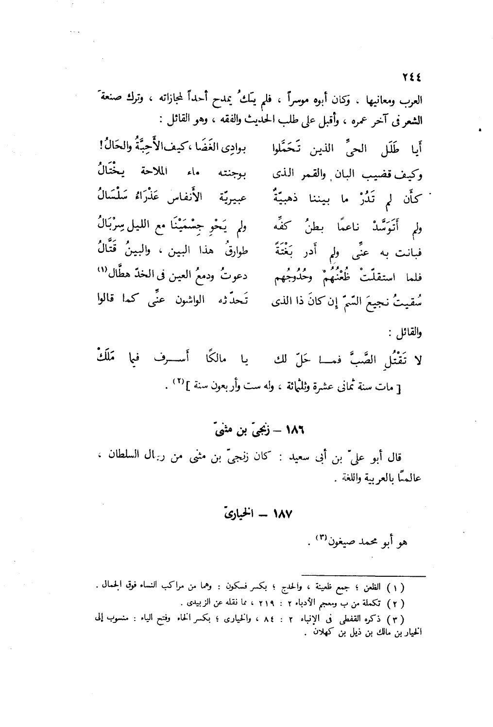 قال أبو علي بن أبي سعيد: كان زنجي بن مثنى من رجال السلطان، عالمًا بالعربية واللغة.