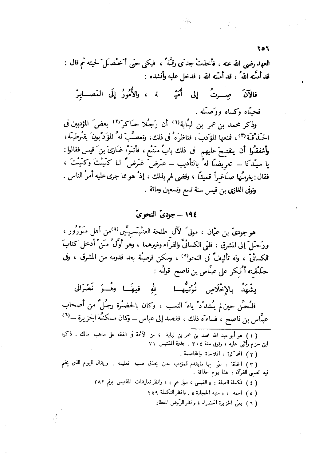 هو جودي بن عثمان، مولًى لآل طلحةَ العَنْبَسِيِّين من أهل مَوْرُور، ورحل إلى المشرق فلقي الكسائي والفراء وغيرهما، وهو أول من أدخل كتاب الكسائي، وله تأليف في النحو، وسكن قرطبة بعد قدومه من المشرق، وفي حلقته أُنكِر على عباس بن ناصح قولُه: