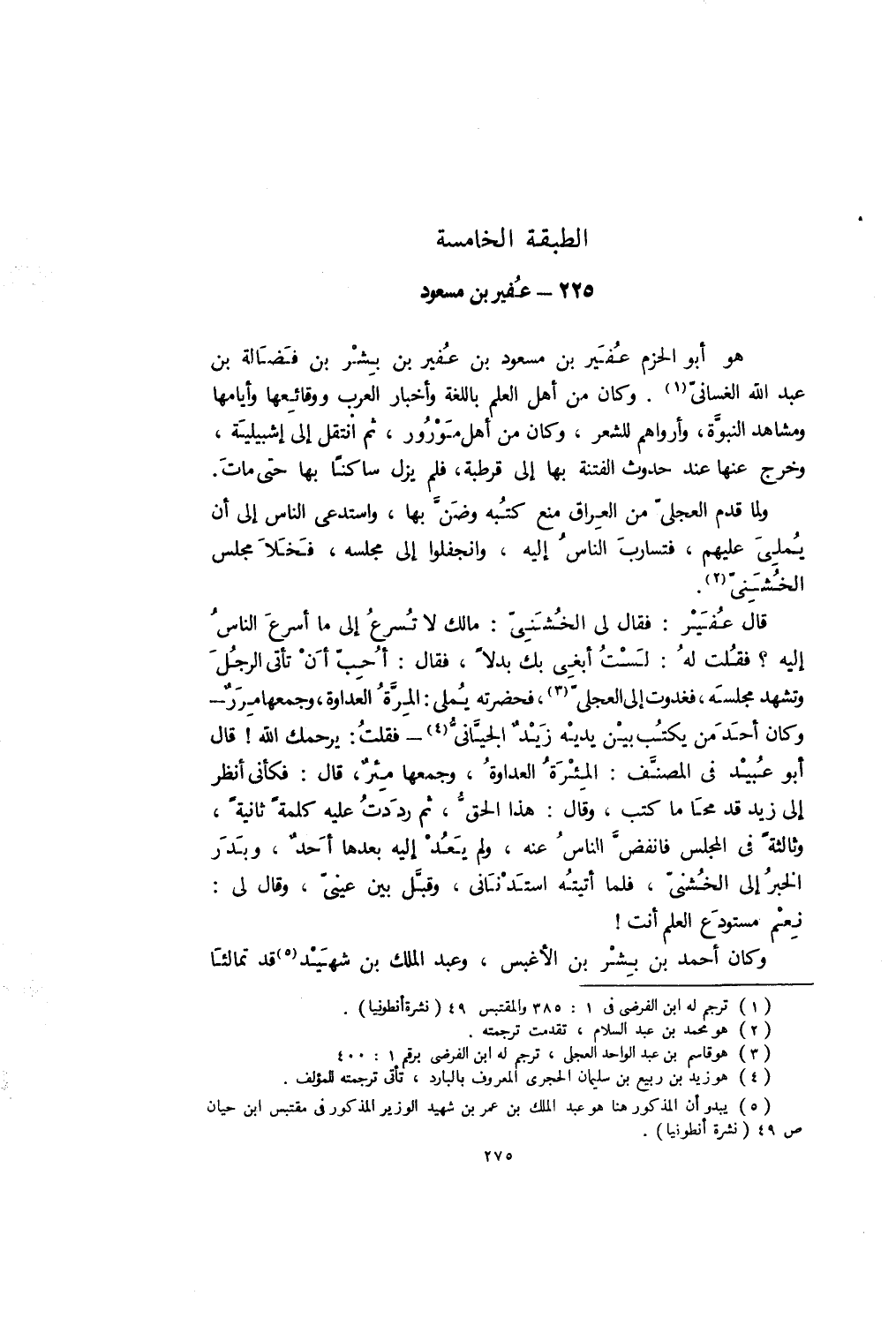 قال عفير: فقال لي الخشني: ما لك لا تسرع إلى ما أسرع الناس إليه؟ فقلت له: لست أبغي بك بدلًا. فقال: أحب أن تأتي الرجل وتشهد مجلسه. فغدوتُ إلى العجلي، فحضرتُه يملي: المِرَّةُ العداوةُ، وجمعُها مِرَرٌ. وكان أحدُ من يكتب بين يديه زيدٌ الجيَّاني، فقلت: يرحمك الله! قال أبو عبيد في "المصنف": المِئْرَةُ العداوةُ، وجمعُها مِئَرٌ. قال: فكأني أنظر إلى زيدٍ قد محا ما كتب، وقال: هذا الحق. ثمَّ رددتُ عليه كلمةً ثانيةً، وثالثةً في المجلس، فانفض الناسُ عنه، ولم يعد إليه بعدها أحد. وبدر الخبرُ إلى الخشني، فلما أتيتُه استدناني، وقبَّل بين عيني، وقال لي: نِعمَ مستودَع العلم أنت!