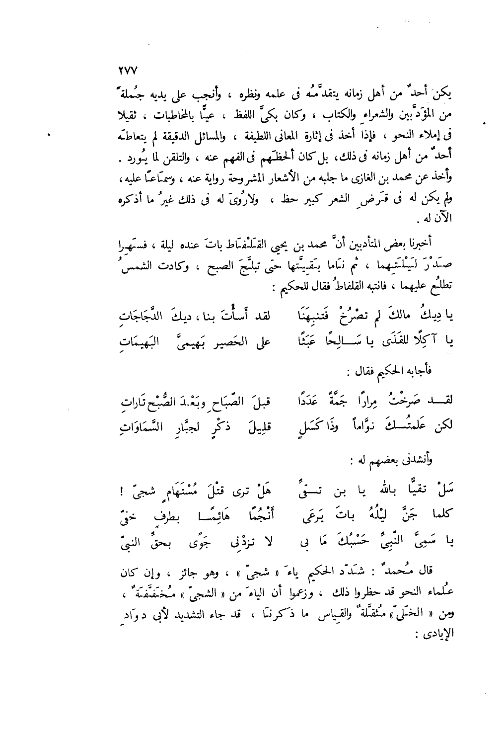 قال محمد: شدَّد الحكيمُ ياءَ "شجيّ"، وهو جائزٌ، وإن كان علماء النحو قد حظروا ذلك، وزعموا أنَّ الياءَ من "الشجي" مخففة، ومن "الخلي" مثقلة، والقياس ما ذكرنا، قد جاء بالتشديد لأبي دواد الإيادي: