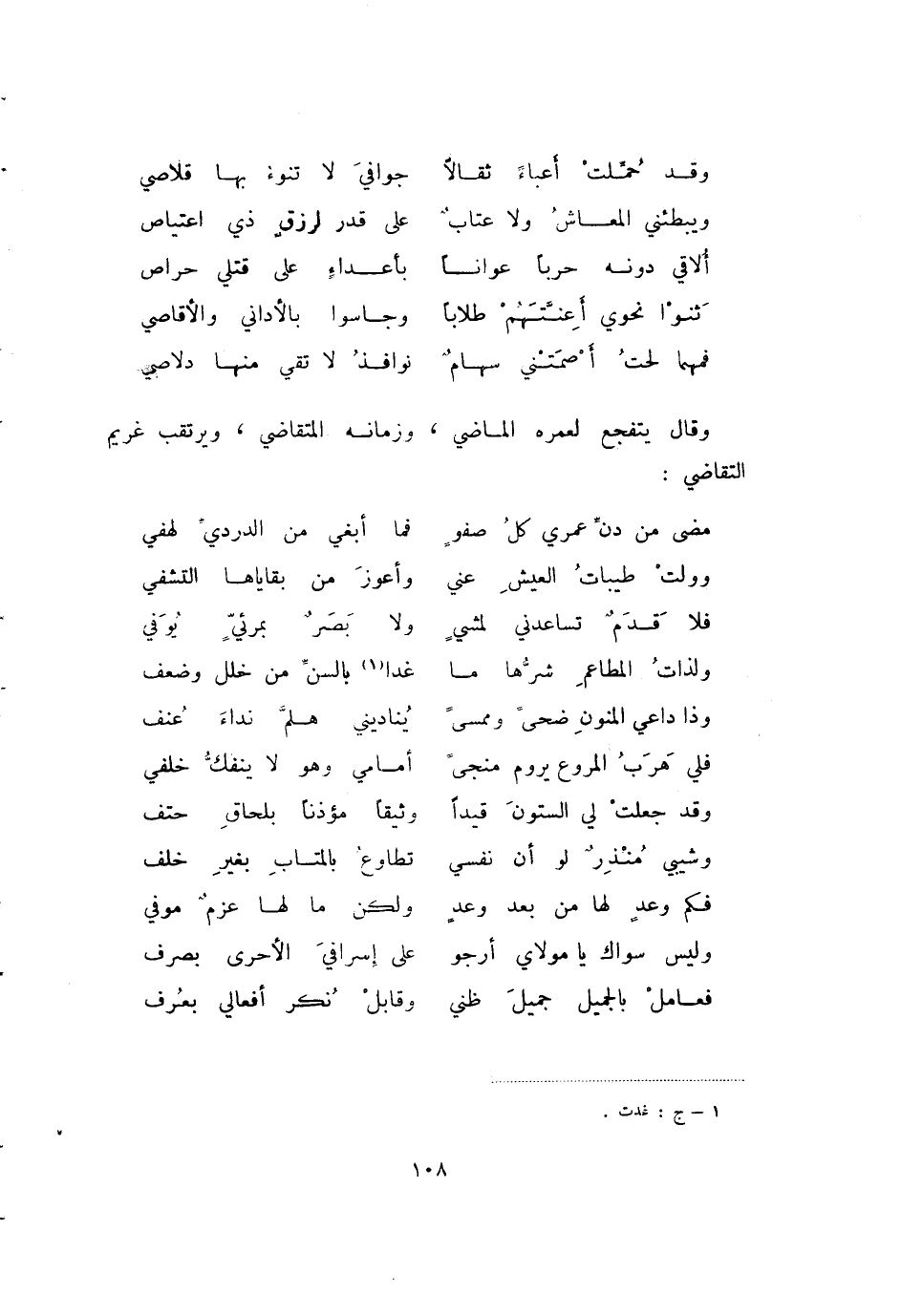 فمهما لحت أصمتي سهام ... نوافذ لا تقي منها دلاصي وقال يتفجع لعمره الماضي، وزمانه المتقاضي، ويرتقب غريم التقاضي: