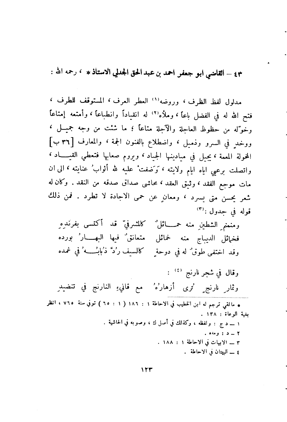 مدلول لفظ الظرف، وروضه (2) العطر العرف، المستوقف للطرف، فتح الله له الفضل باعا، وملاه (3) له انقيادا وانطباعا، أمتعه إمتاعا وخوله من حظوظ العاجلة والآجلة متاعا؛ ما شئت من وجه جميل، ووخد في السرو وذميل، واضطلاع بالفنون الجمة، والمعارف [36ب] المخولة المعمة، يجيل في ميادينها الجياد، ويروم صعابها فتعطي القياد، واتصلت برعيي إياه أيام ولايته، وضفت عليه لله أثواب عنايته، إلى أن مات موجع الفقد، وثيق العقد، محاشى صداق صدقه من النقد. وكان له شعر يحسن متى يسرد، ومعان عن حمى الإجادة لا تطرد. فمن ذلك قوله في جدول (4) :