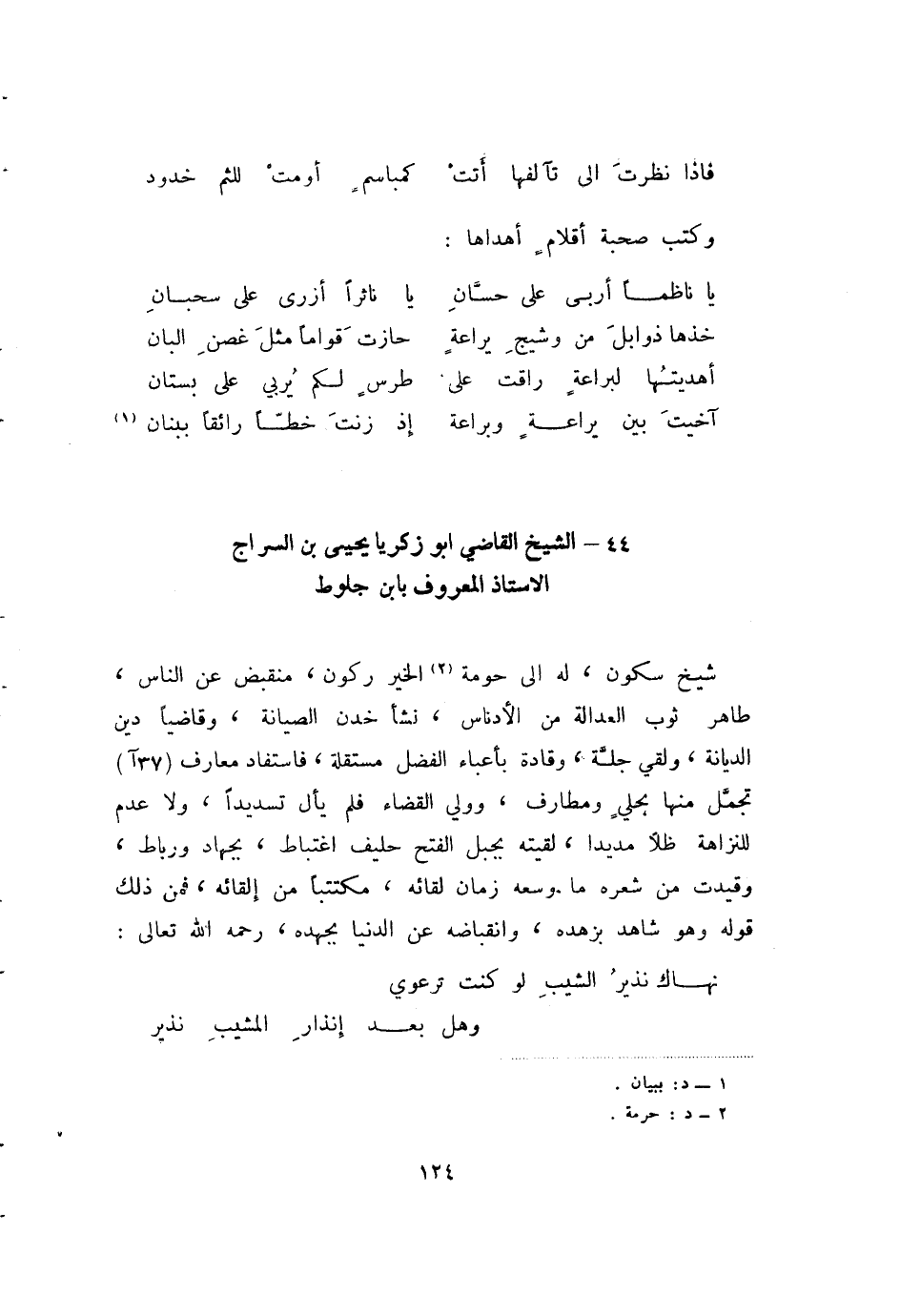 آخيت بين يراعة وبراعة ... (1) إذ زنت خطا رائقا ببنان 44 - الشيخ القاضي أبو زكريا يحيى بن السراج