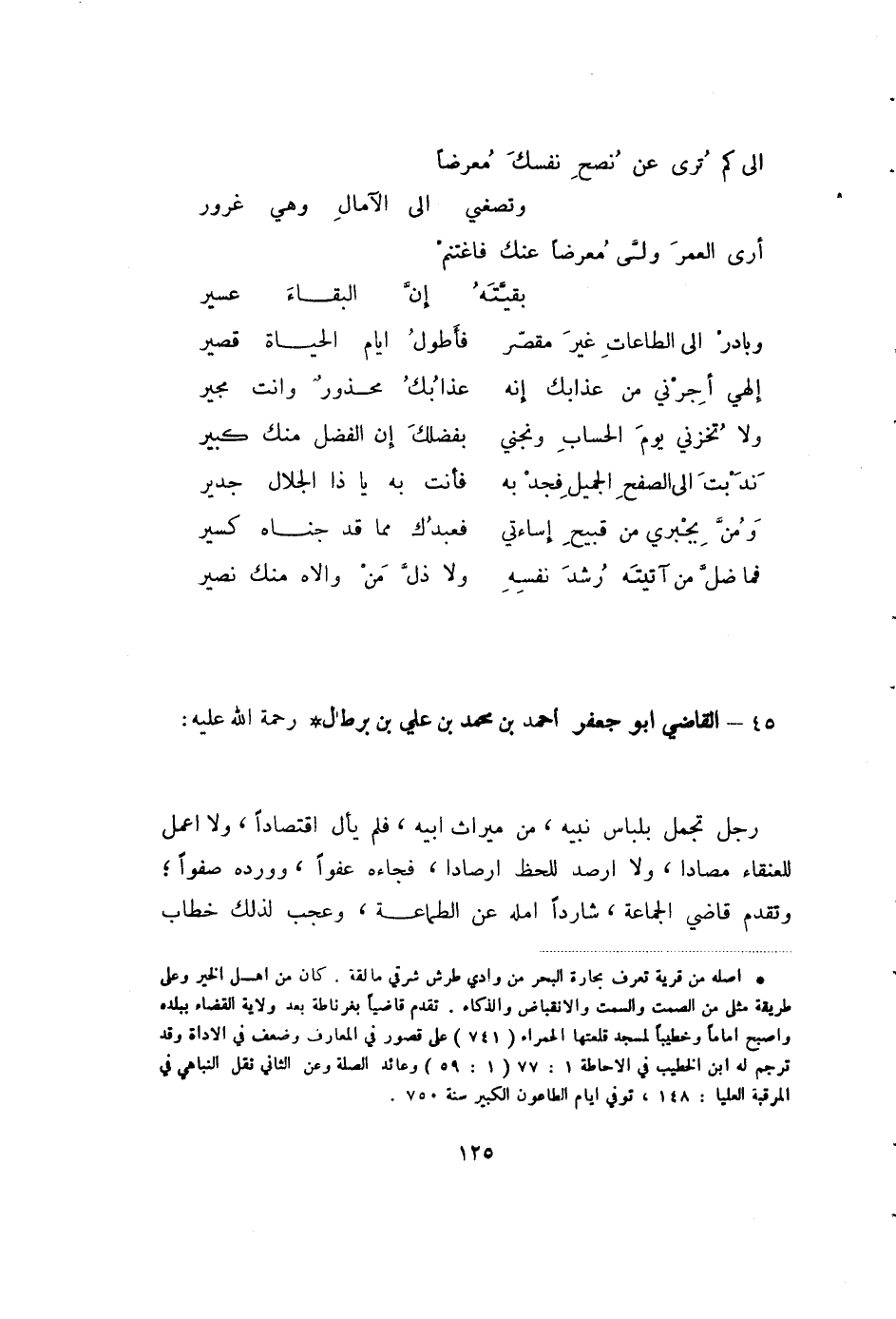 فما ضل من أتيته رشد نفسه ... ولا ذل من والاه منك نصير 45 - القاضي أبو جعفر احمد بن محمد بن علي بن برطال (1) رحمة الله عليه: